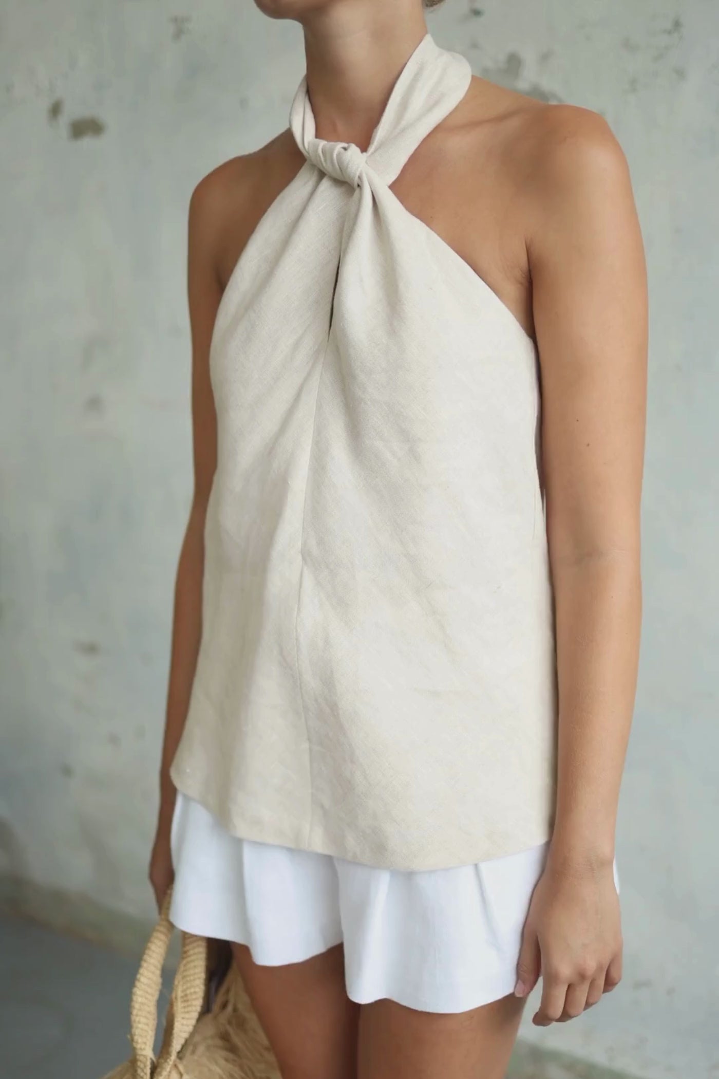 An easy-summer top crafted in a luxe 100% linen fabrication. Cut along the bias for soft drape throughout. Featuring a cross-over halter neck detail, for an elevated take on a classic halter silhouette.