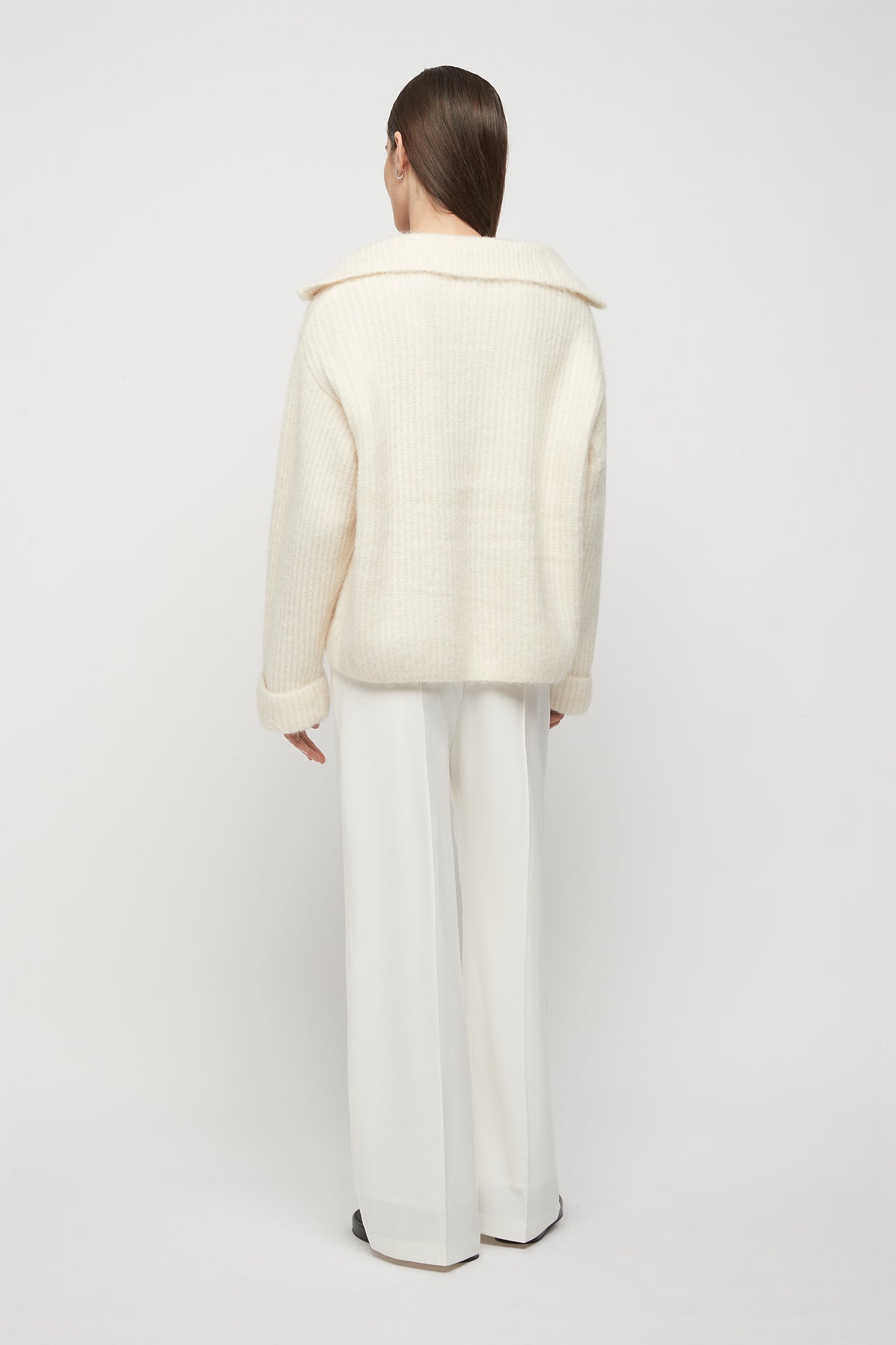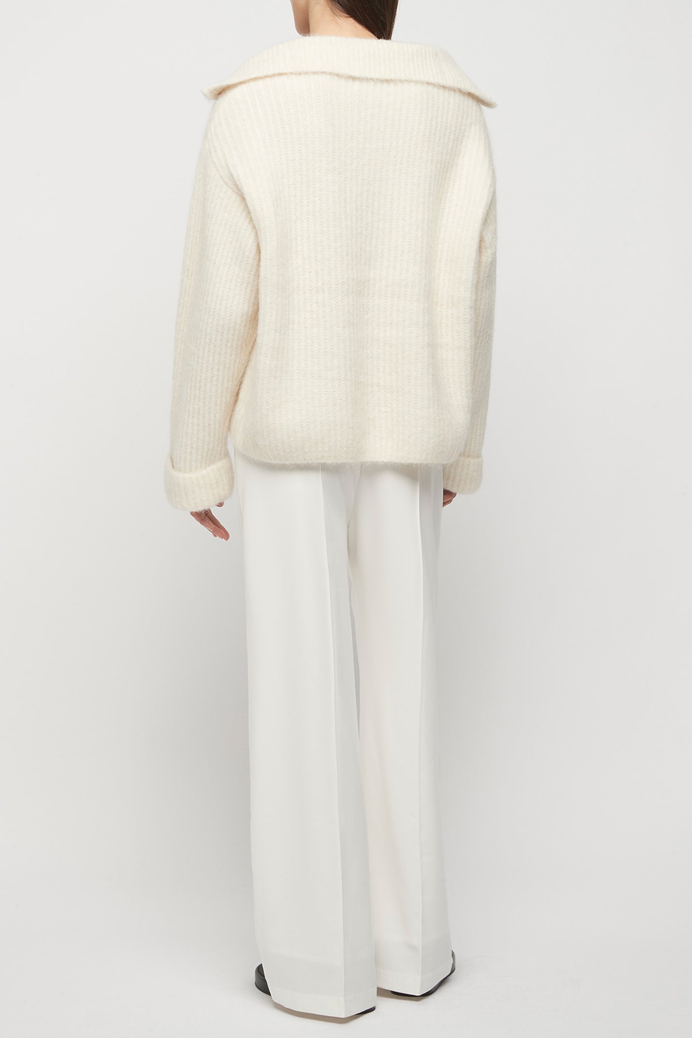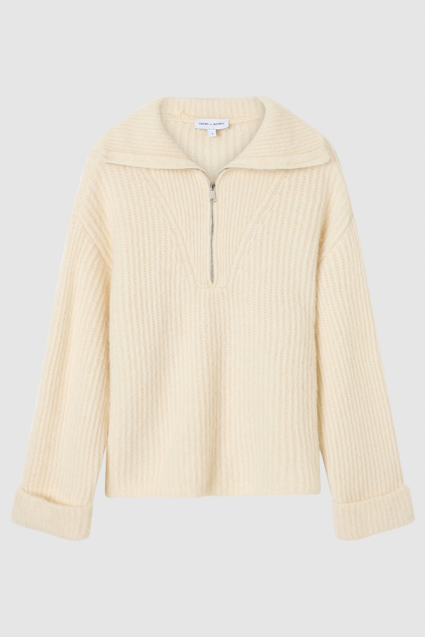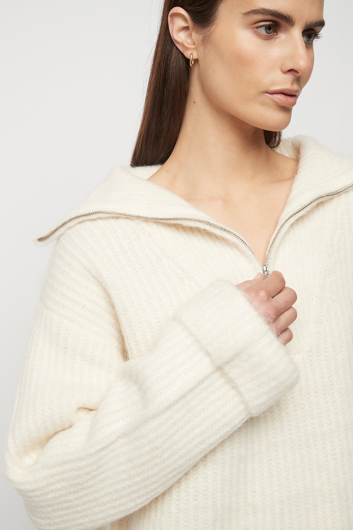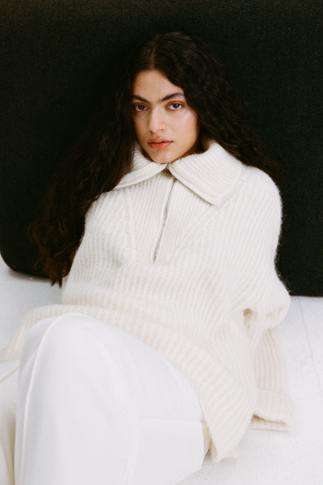 A fluffy pullover style knit, knitted from a soft alpaca wool-blend yarn. Features a versatile half zip closure, designed to be worn open for a slouched relaxed look, or closed.
