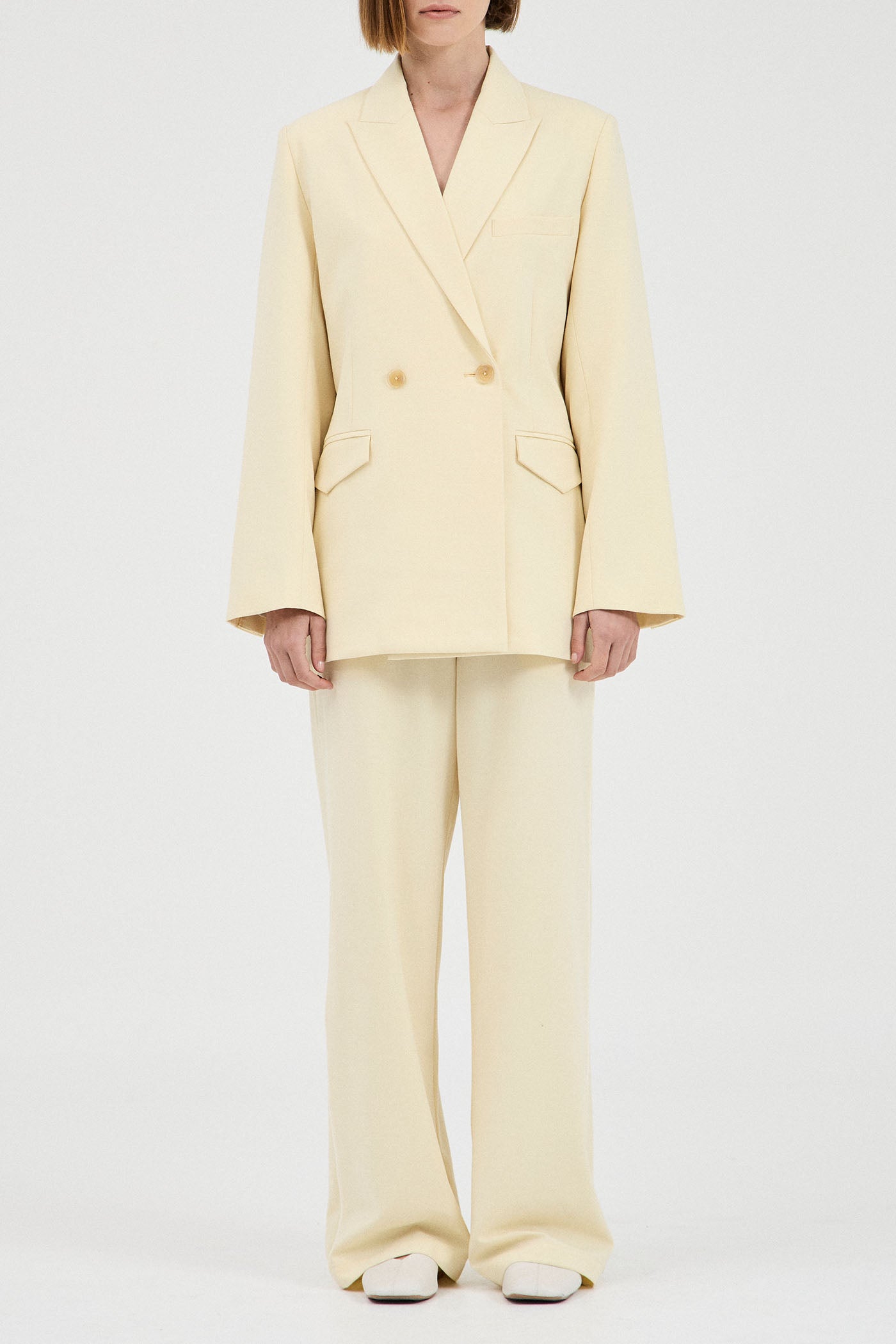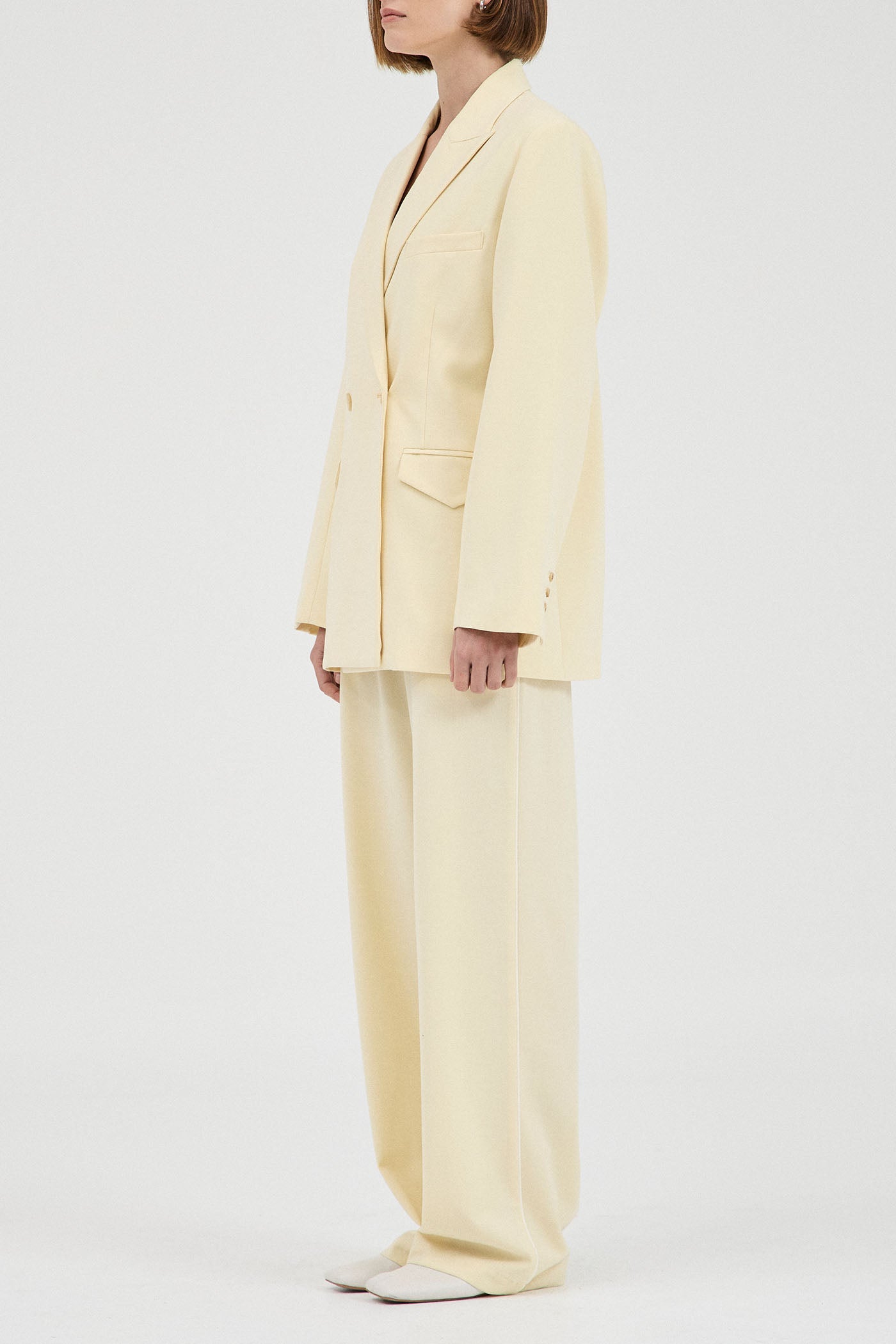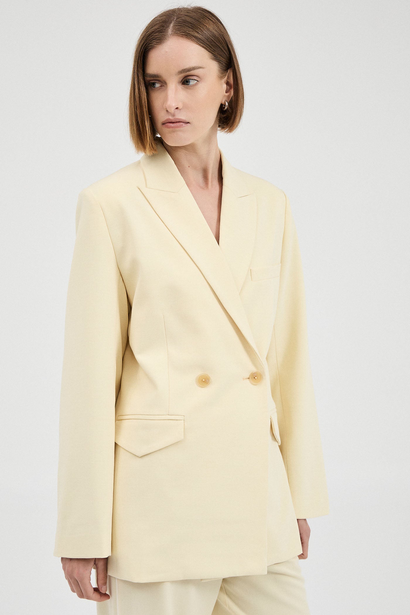 A luxe double breasted blazer cut from a premium wool-blend suiting fabrication. Designed in a muted shade of butter for an updated yet timeless addition to the capsule wardrobe. Featuring a relaxed fit, tapered at the waist for a flattering effect.