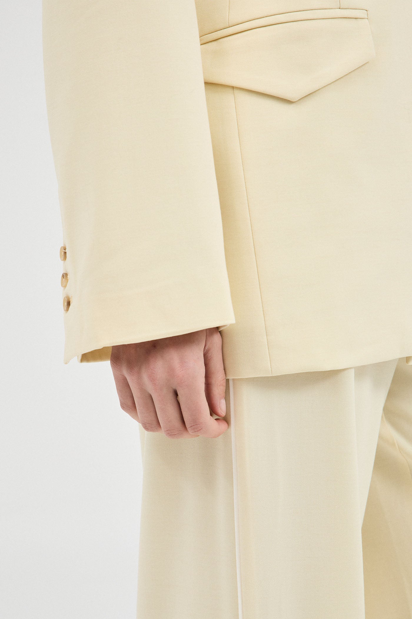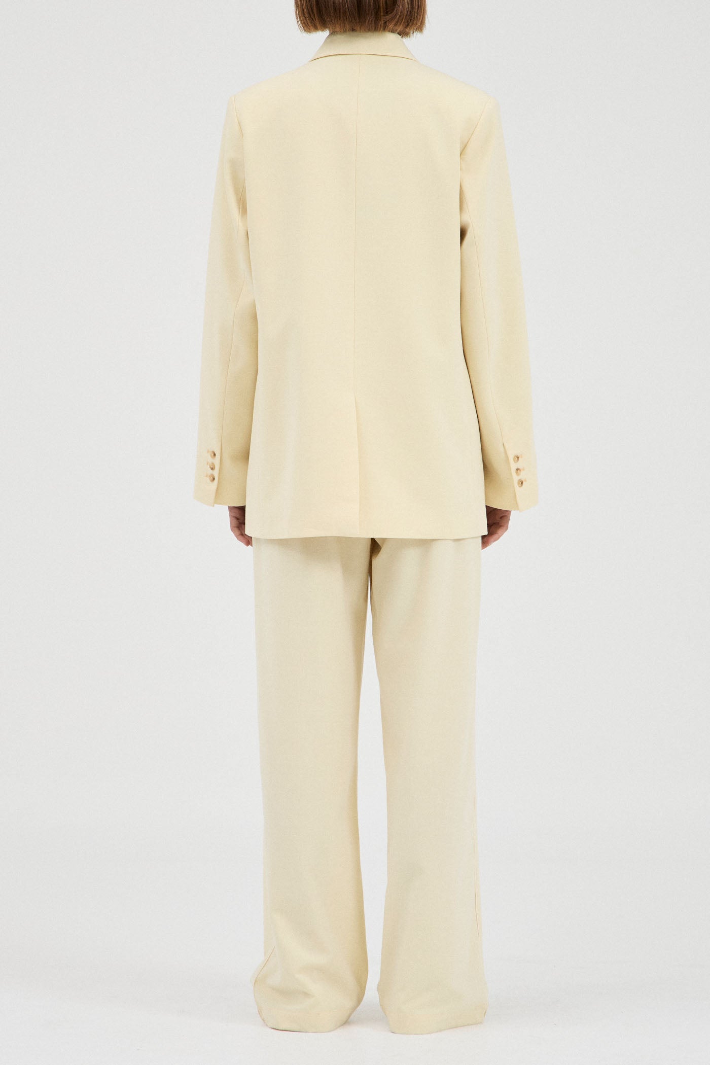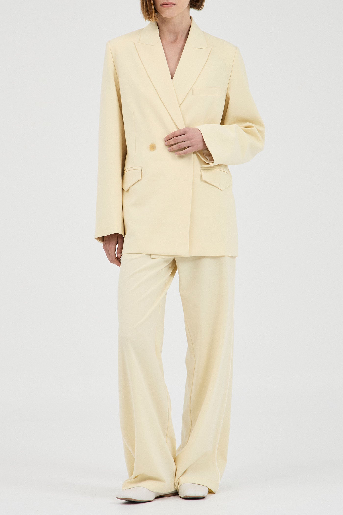 A luxe double breasted blazer cut from a premium wool-blend suiting fabrication. Designed in a muted shade of butter for an updated yet timeless addition to the capsule wardrobe. Featuring a relaxed fit, tapered at the waist for a flattering effect.