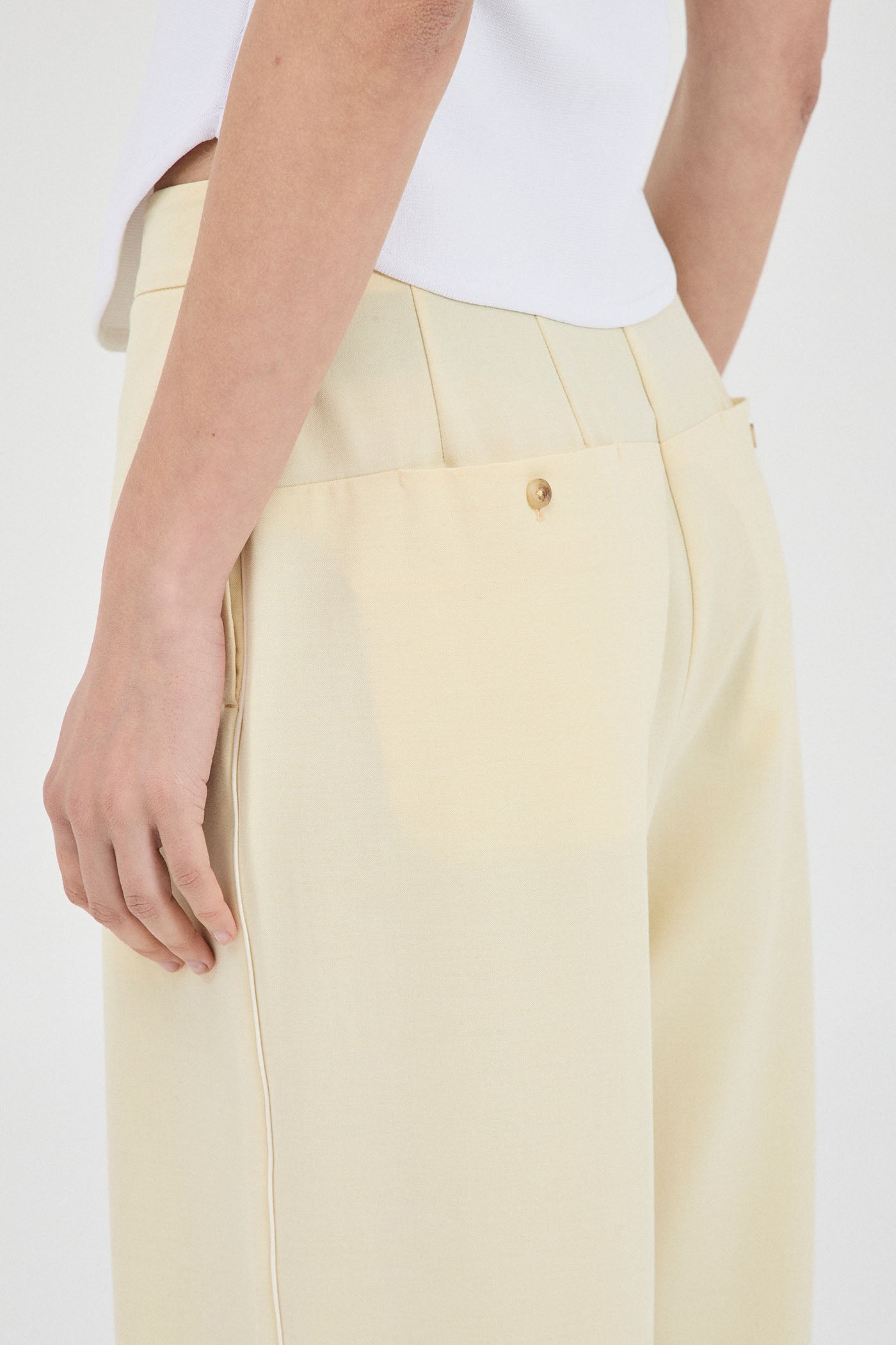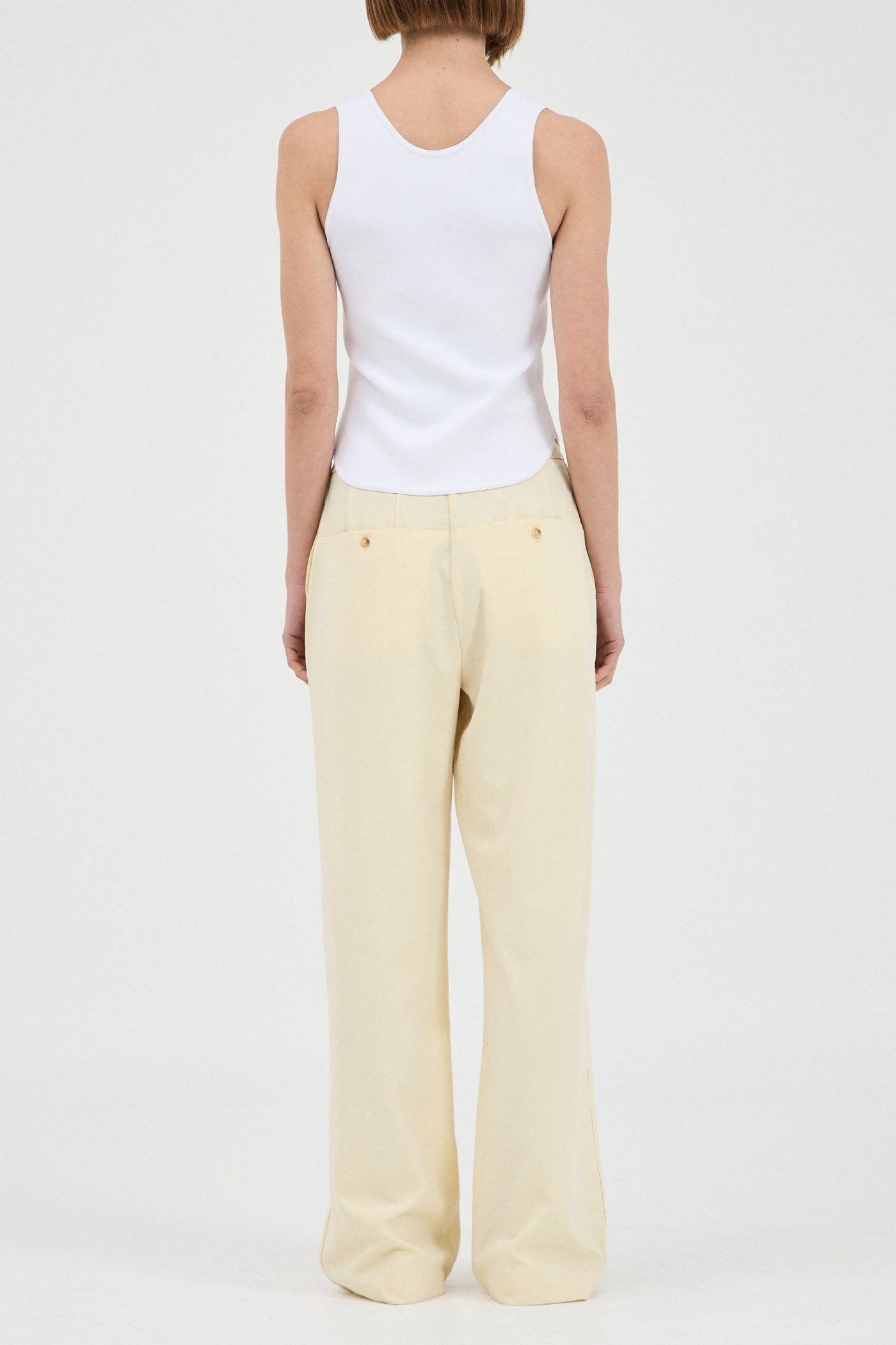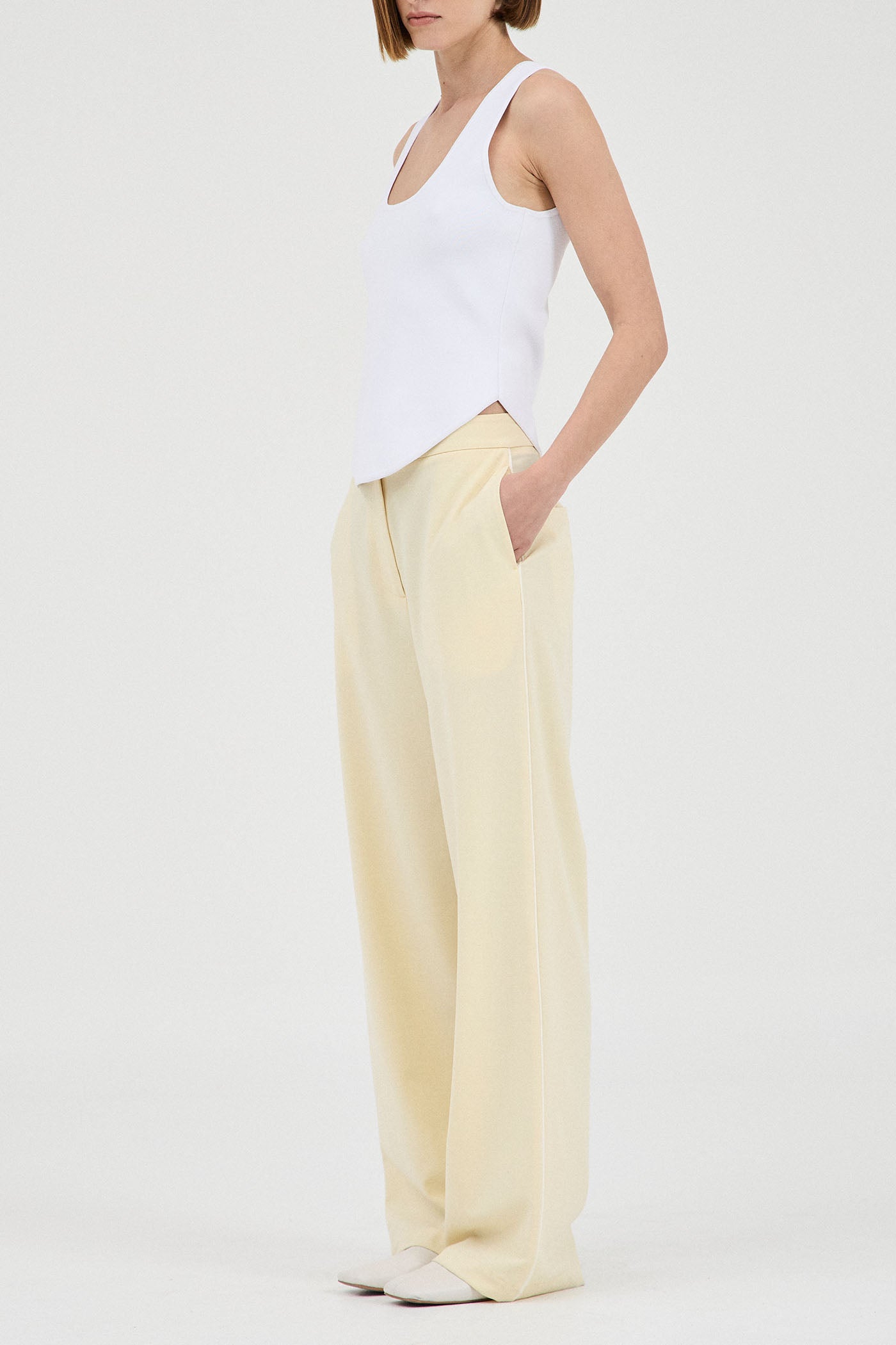 A classic cut tailored trouser, crafted from a premium wool-blend suiting fabrication. Designed in a muted shade of butter for an updated yet timeless addition to the capsule wardrobe. Featuring a contrast piping detail along the side seam for a relaxed, everyday approach.