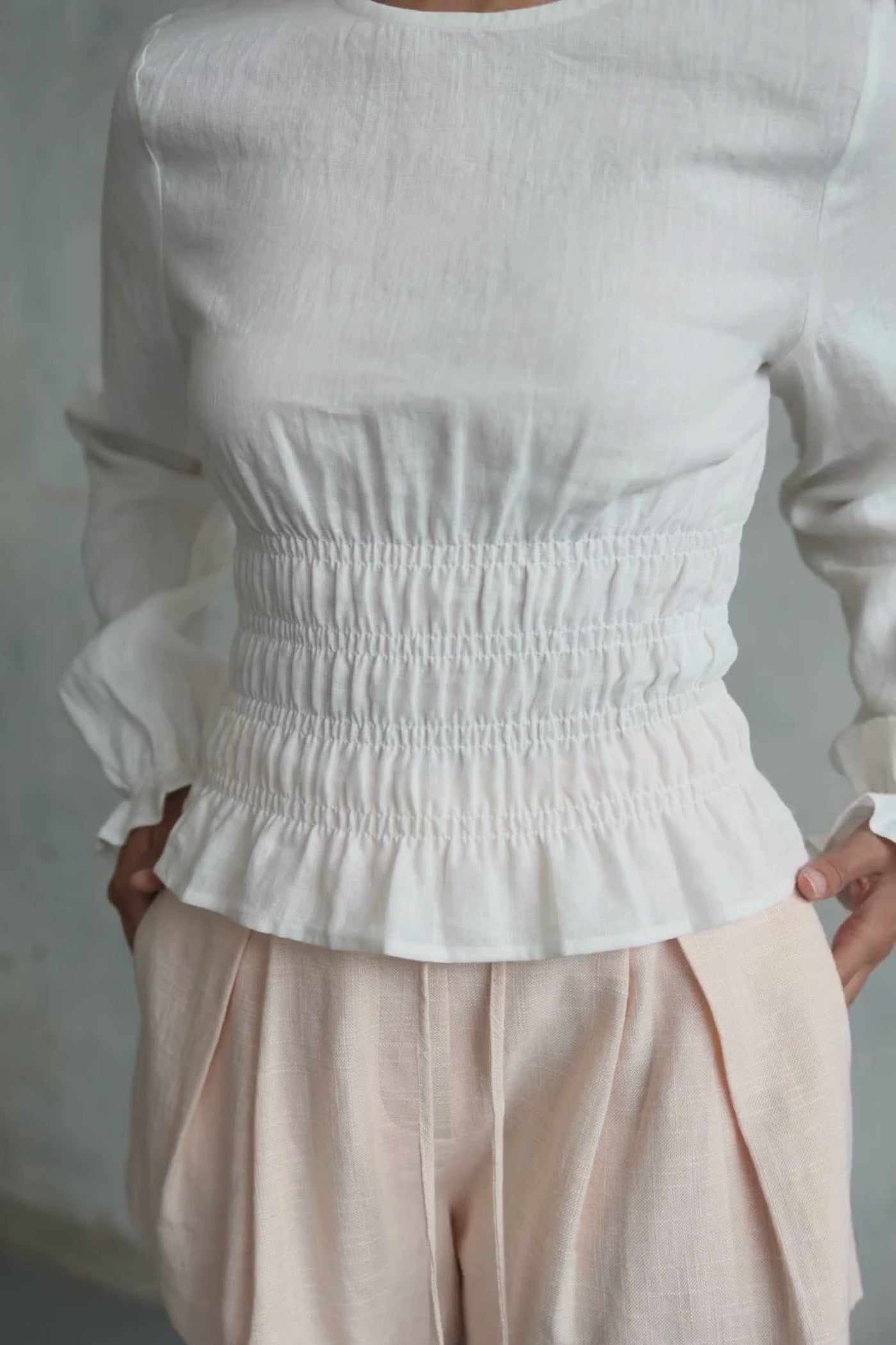 A long sleeve top crafted in a 100% linen fabrication. Featuring a lightly shirred bodice design and elastic cuffs with a frilled sleeve finish.