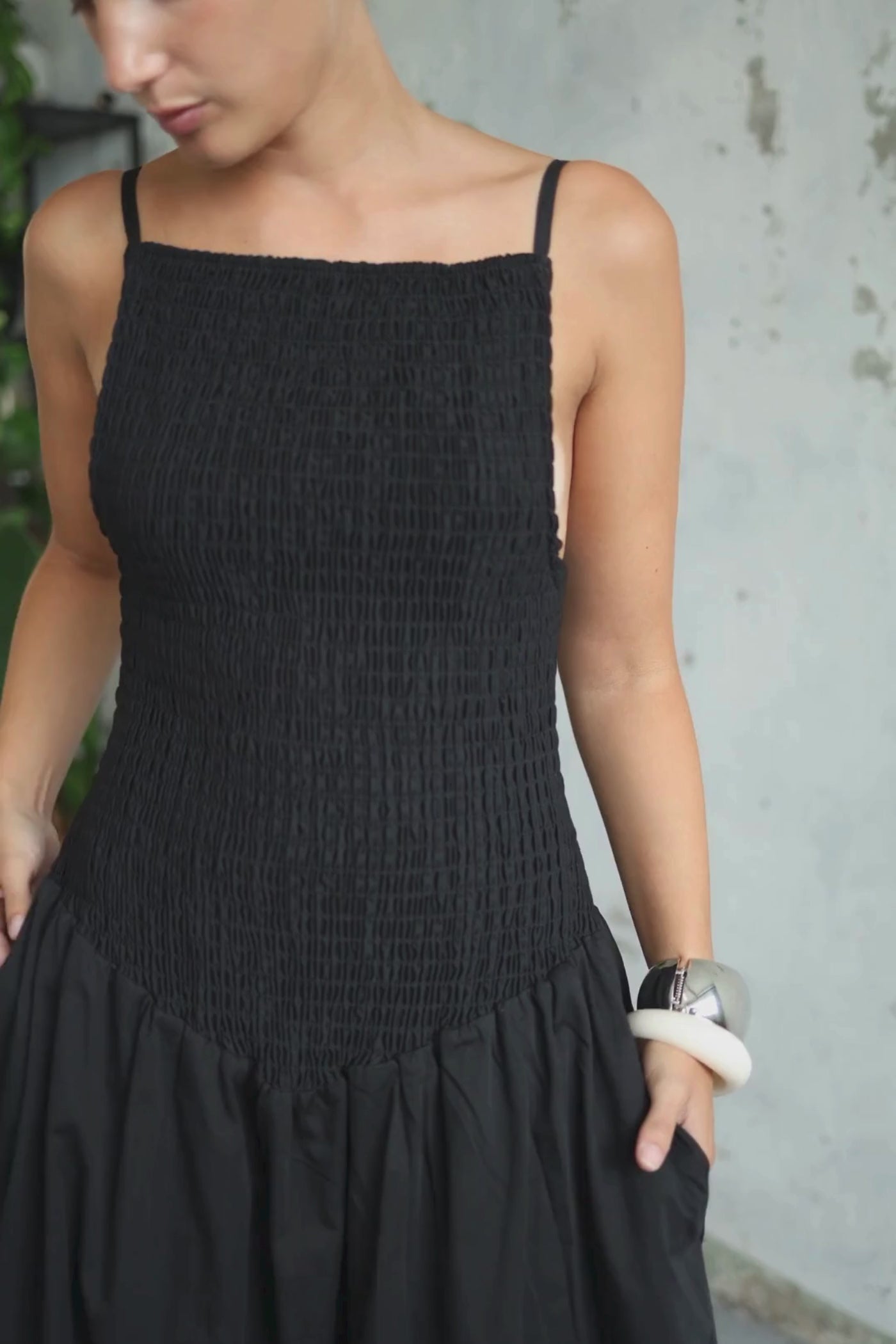 A longline summer dress crafted in a luxe 100% cotton fabrication. Featuring an all over shirred fitted bodice design with a full draped skirt.