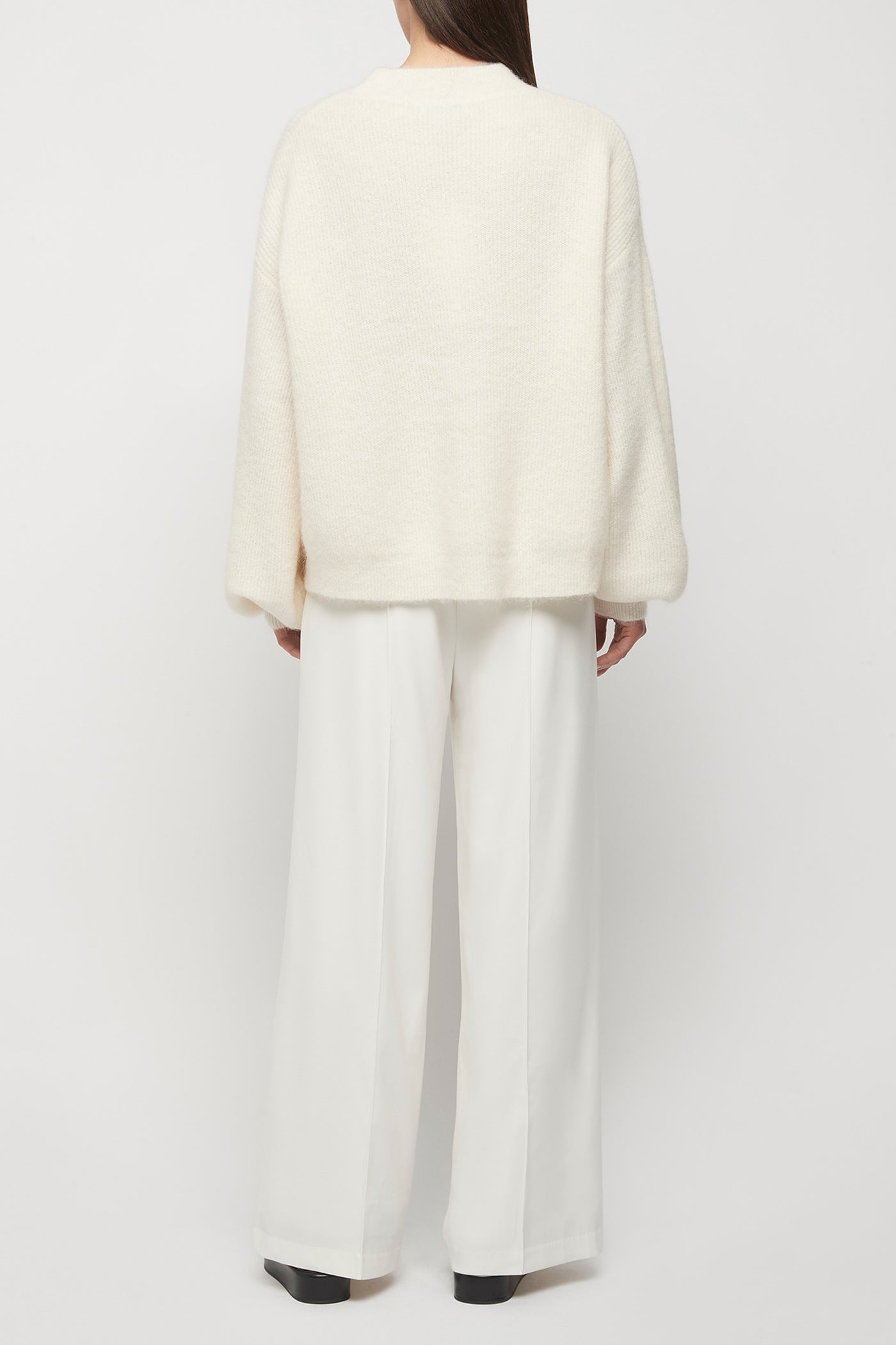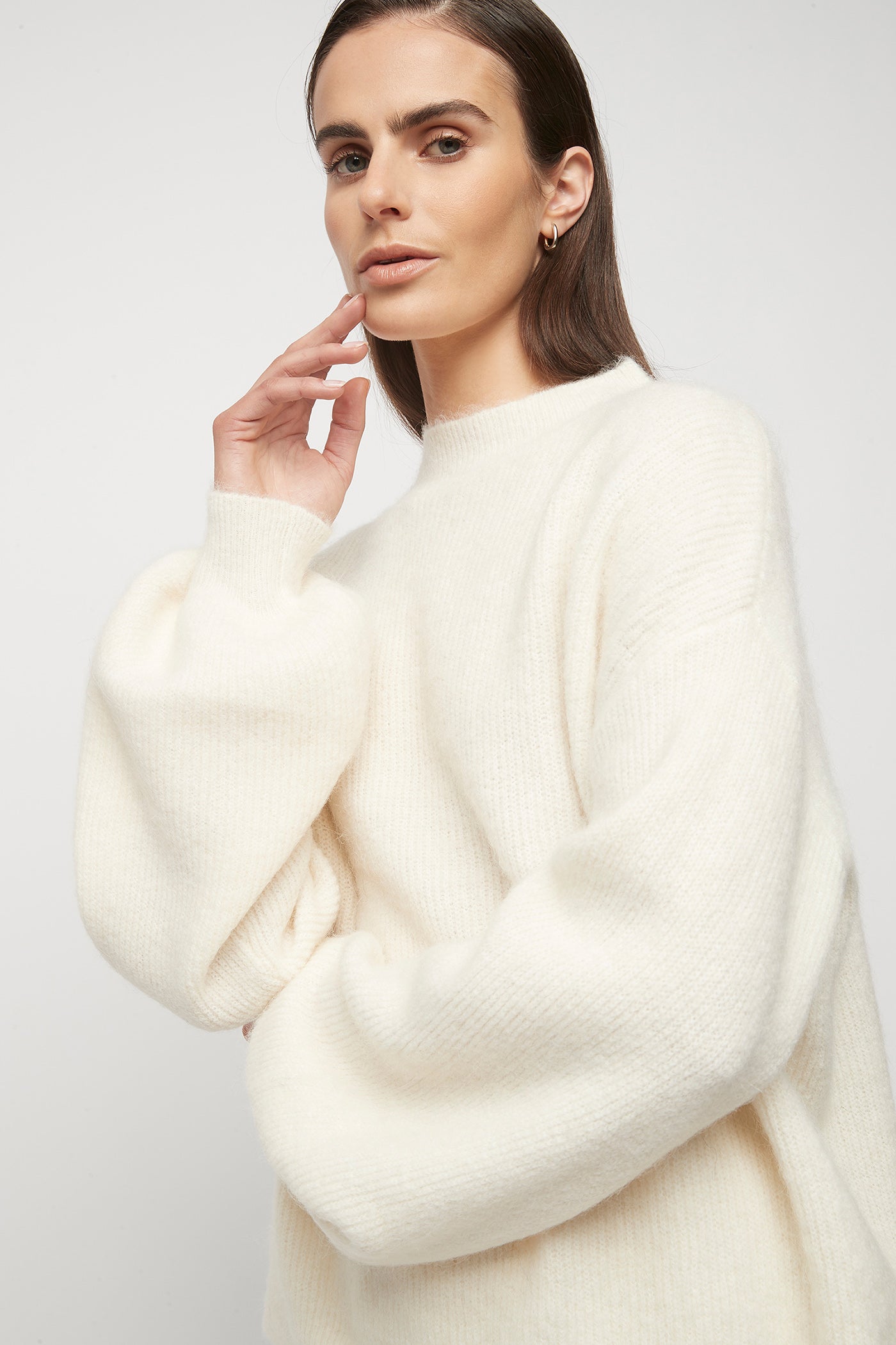 A fluffy winter knit crafted in a luxe alpaca-wool blend fabrication. Designed in a relaxed silhouette, featuring soft balloon sleeves and a high neckline.