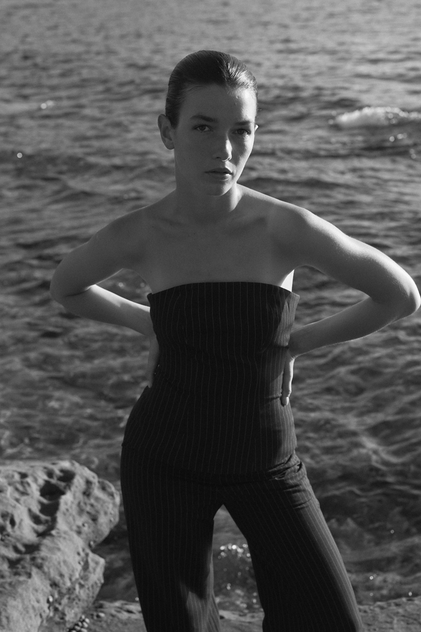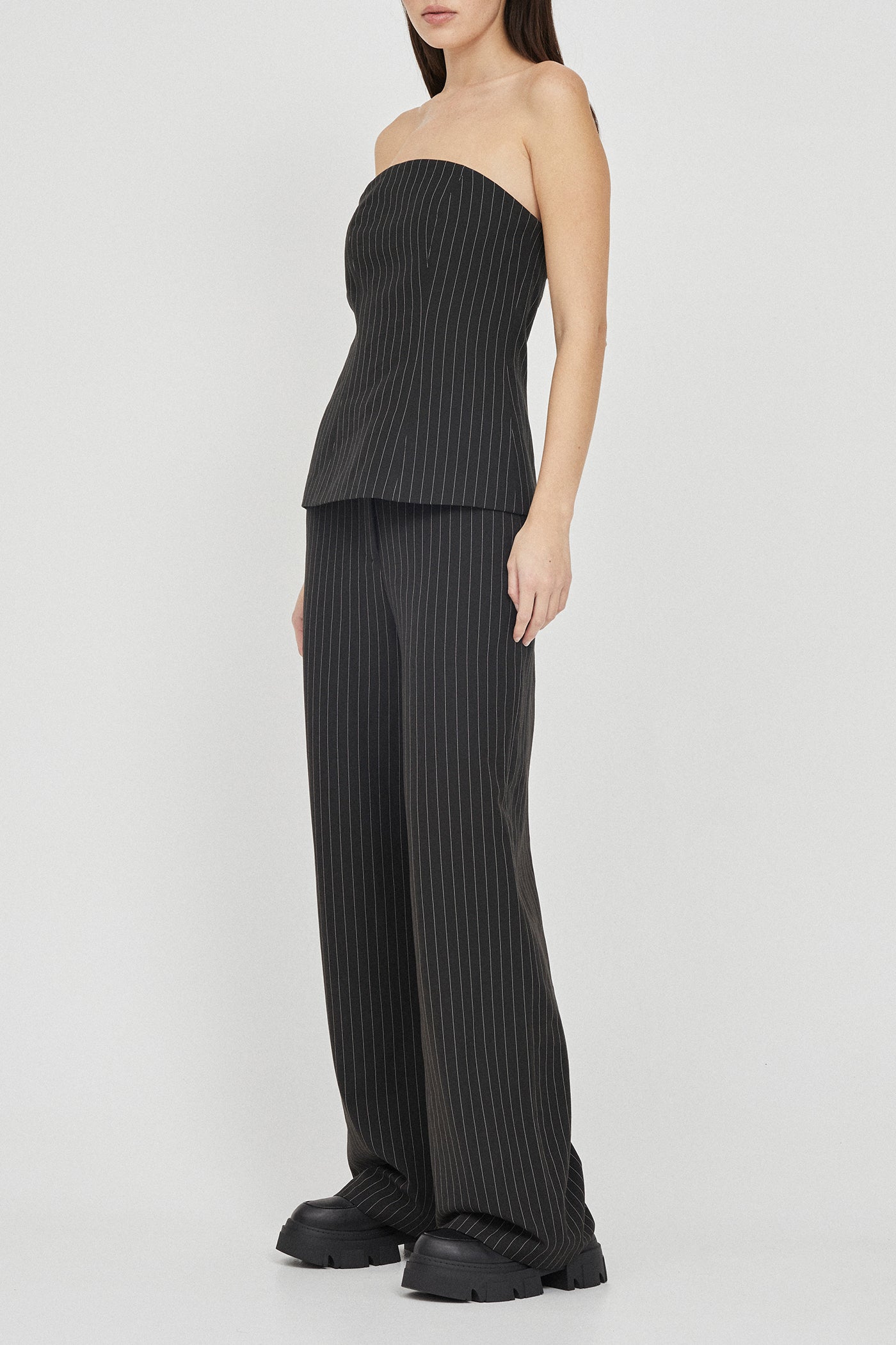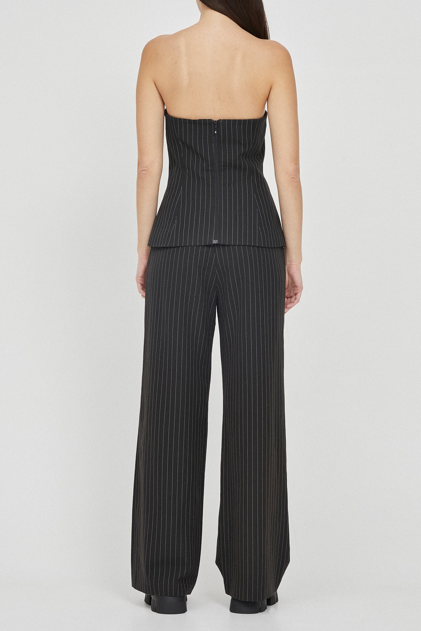 A strapless bustier style top, designed in our season signature pinstripe. Featuring a curved neckline and peplum hem.