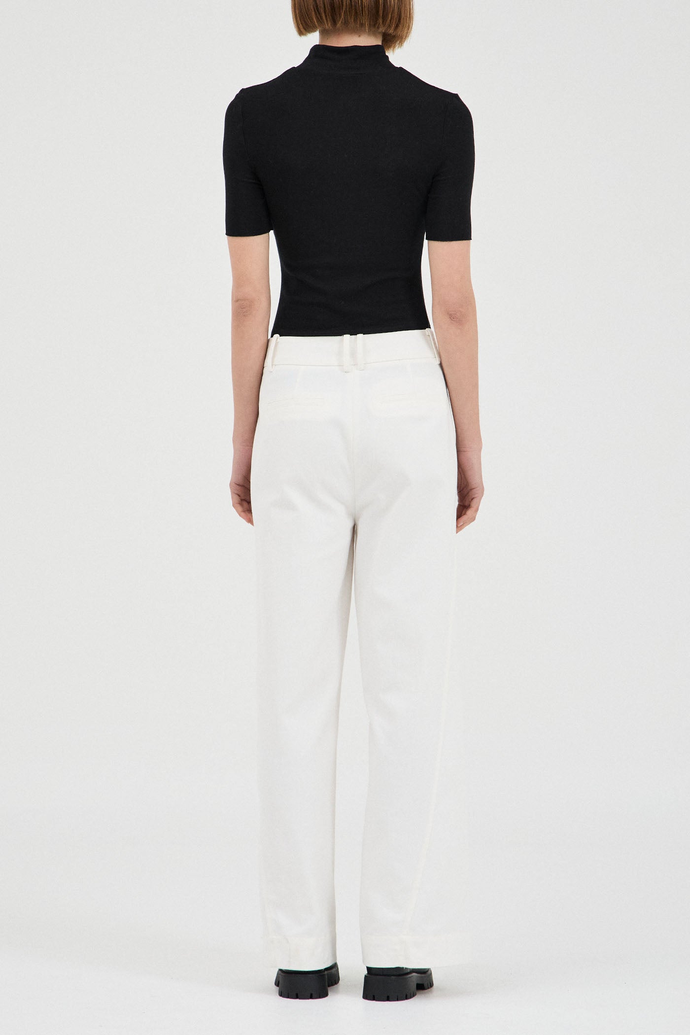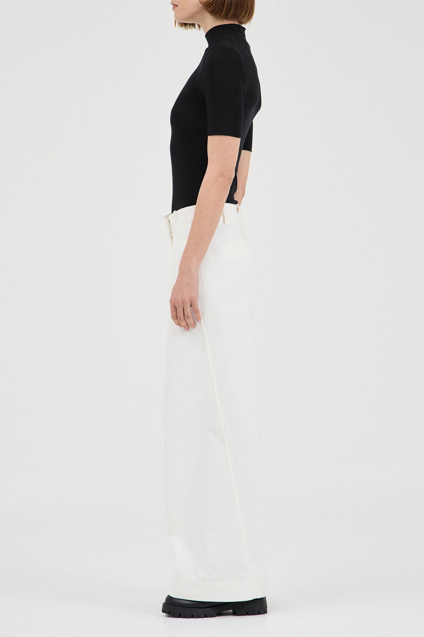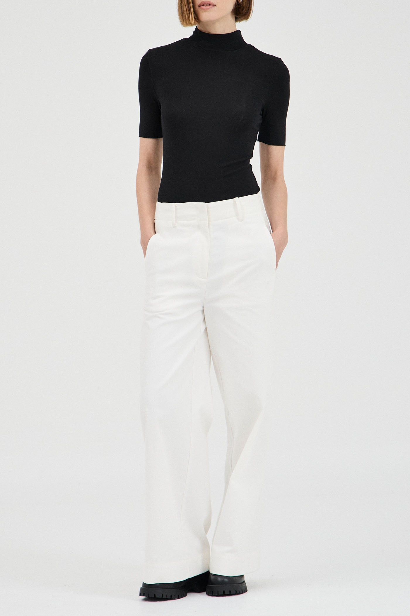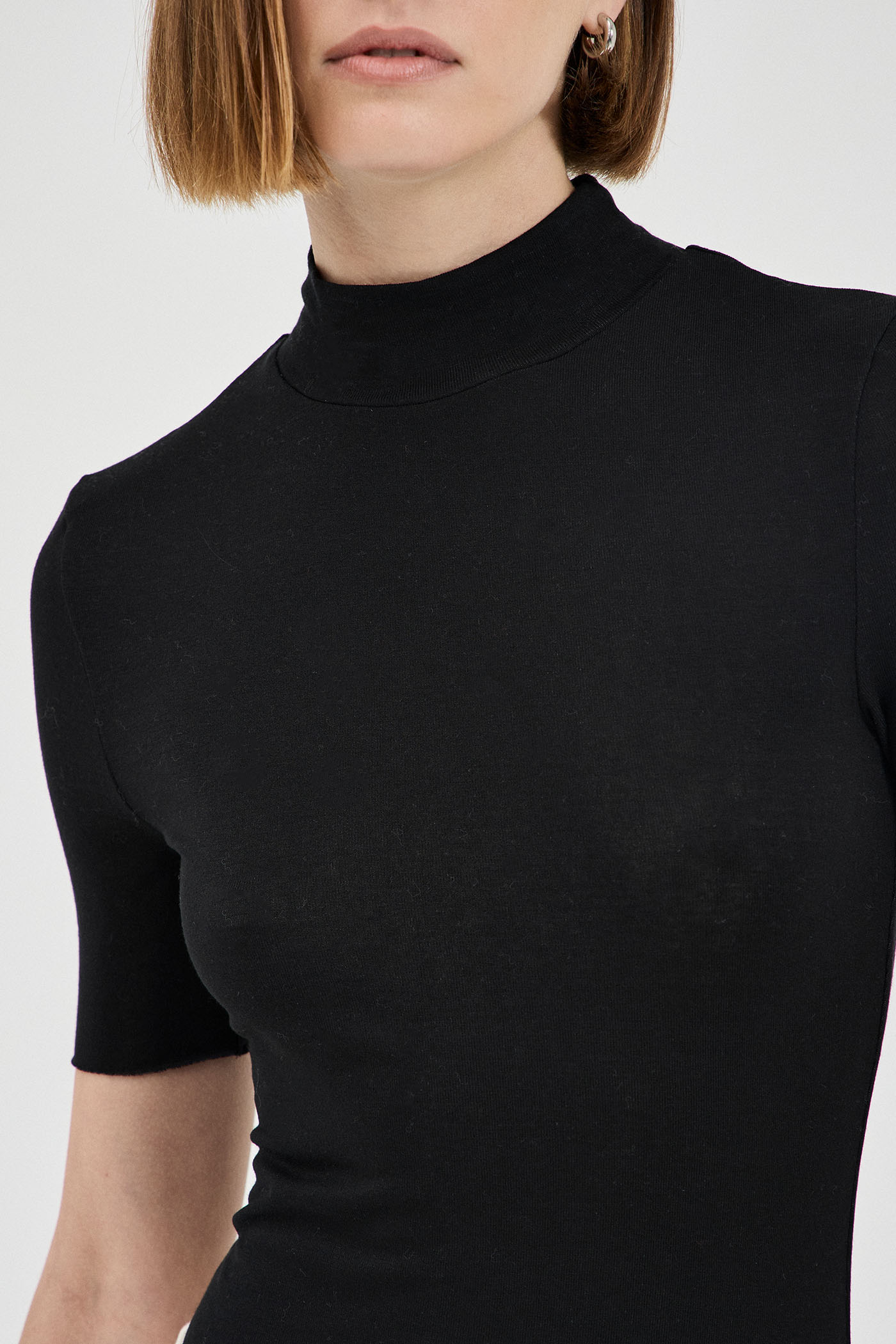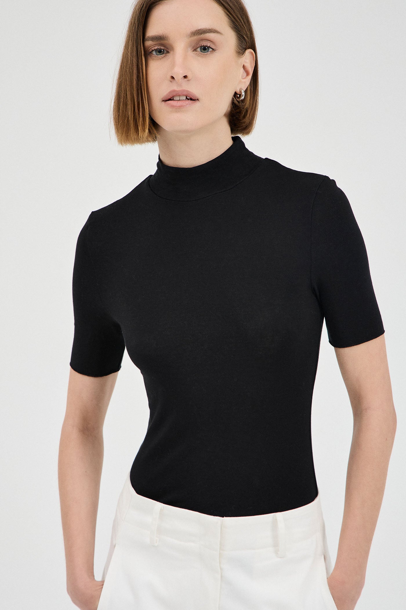 A classic black top, crafted in a premium tencel wool fabrication. Featuring a slim, short-sleeve silhouette with a flattering high neck. A perfect layering piece designed for the core wardrobe.
