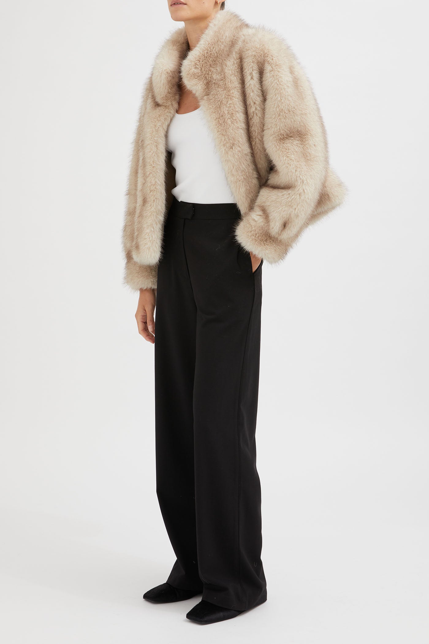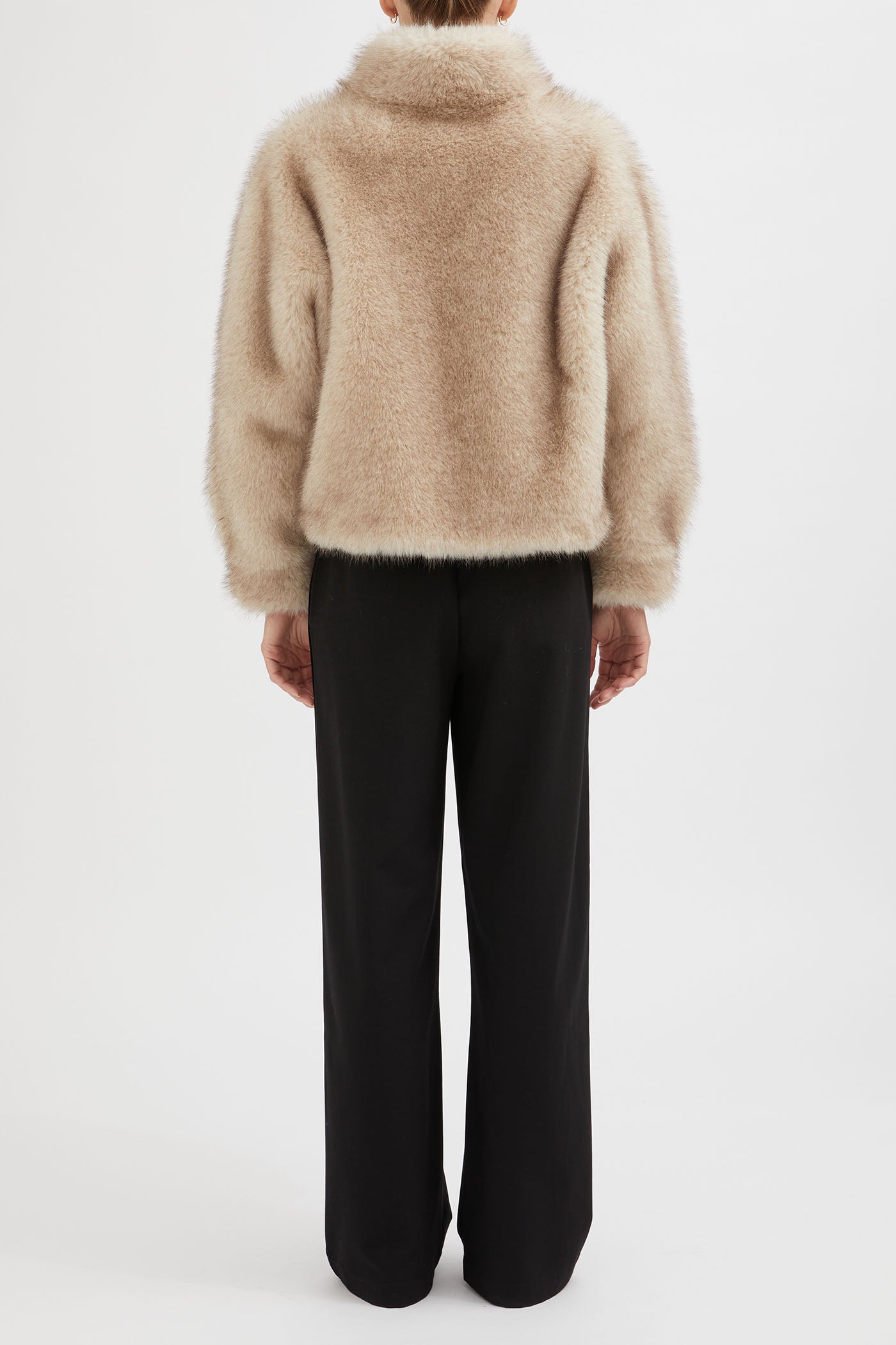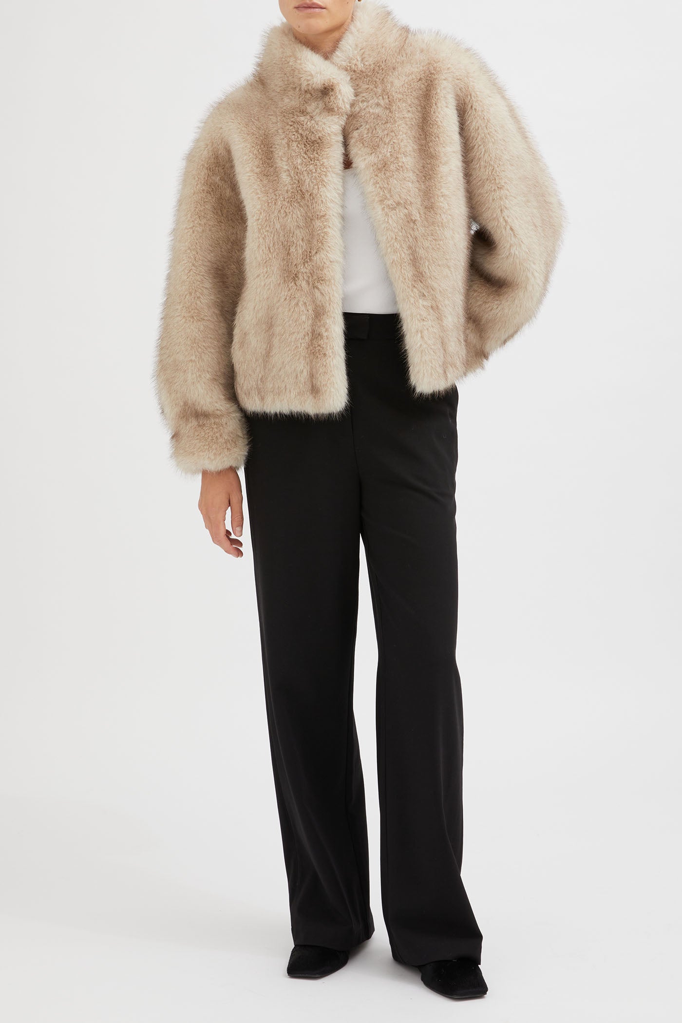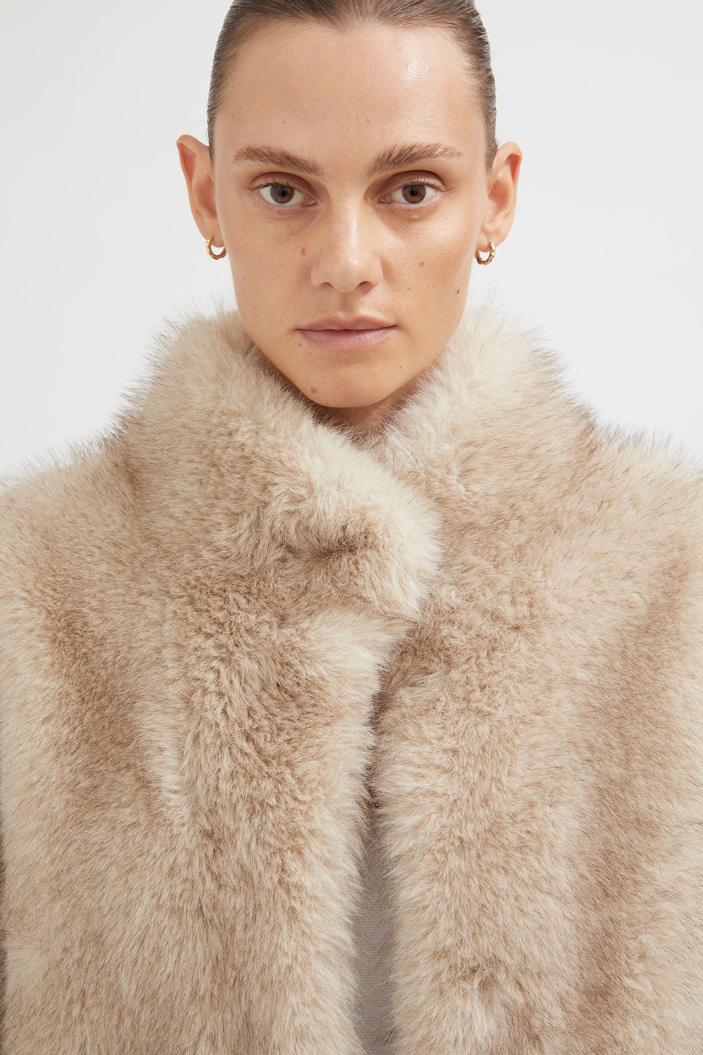 A sumptuous faux fur jacket. Cut with an oversized fit, it has hidden hook and eye closures to secure the front. The high collar and front pockets allow for optimal warmth.