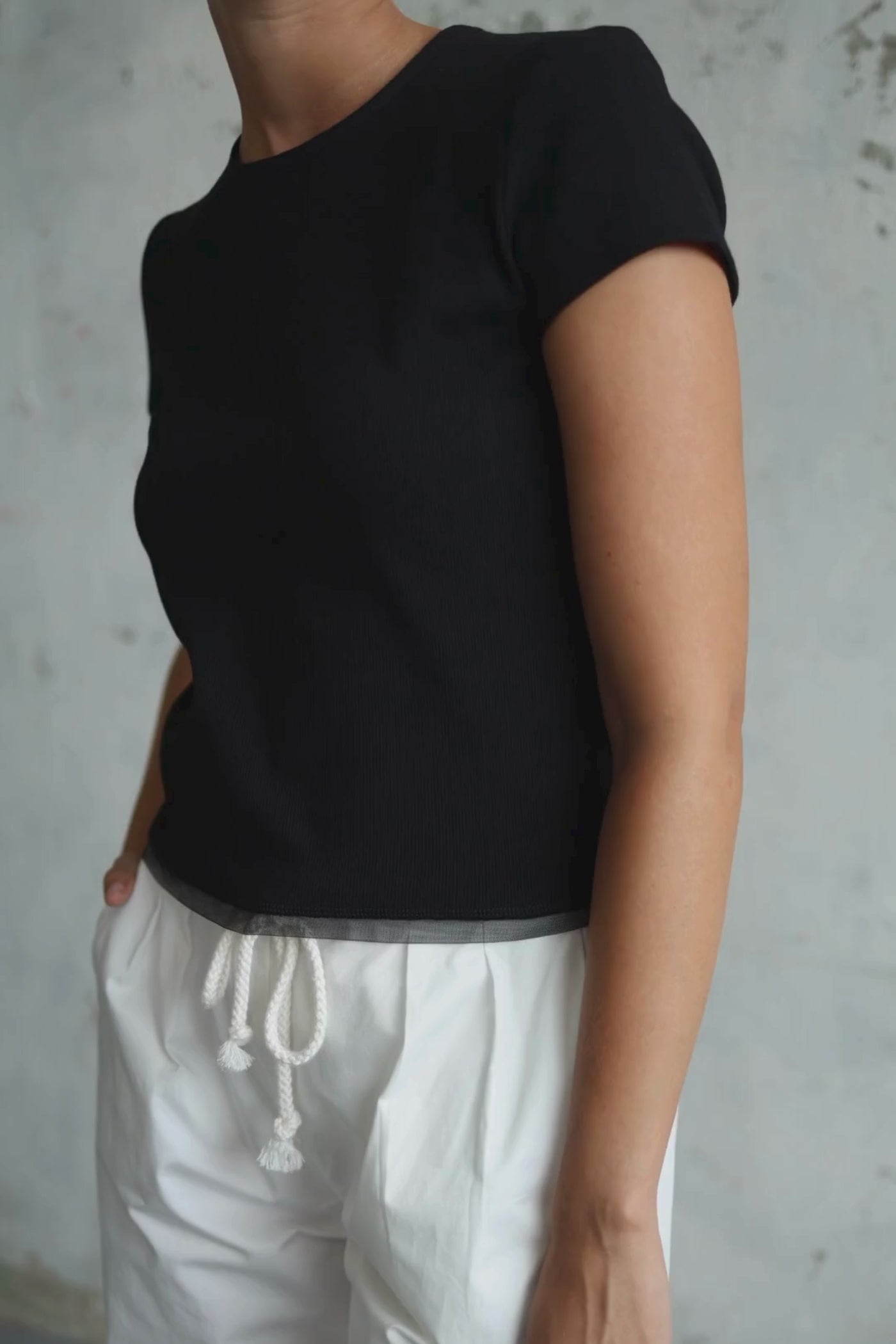 A staple baby tee, crafted from stretch ribbed cotton fabric. Designed with a unique stretch mesh trim along the hem for a modern twist. Available in black and white.