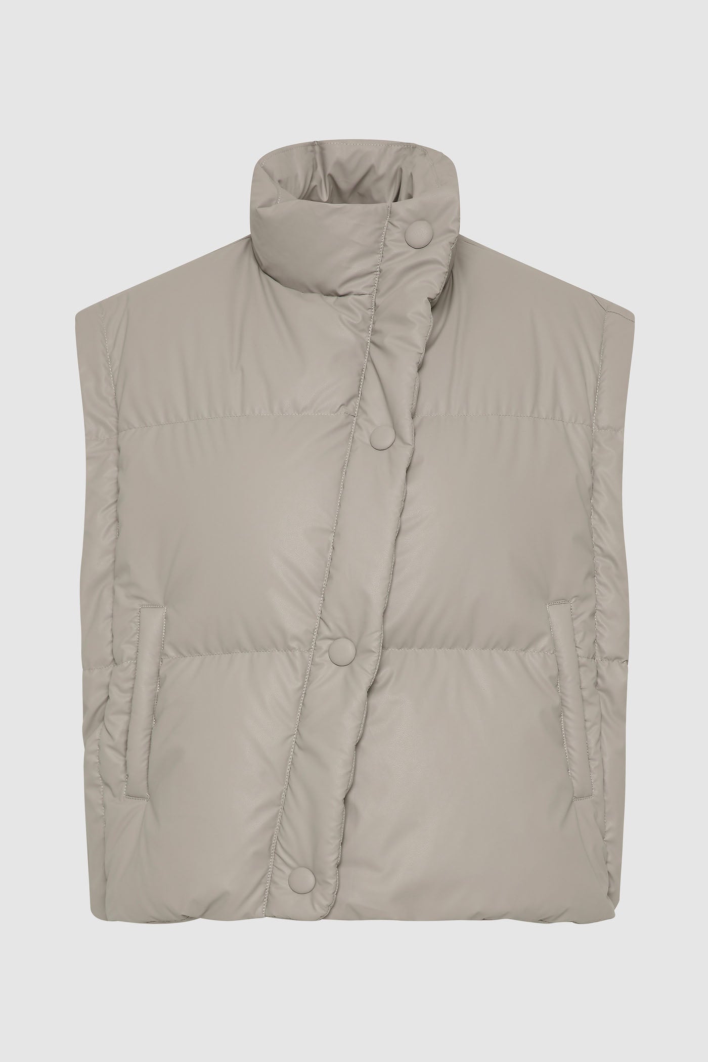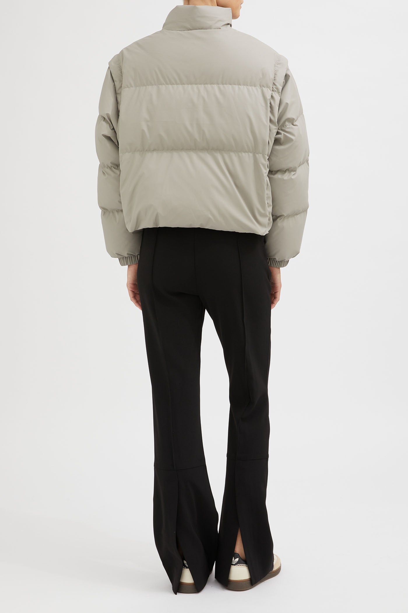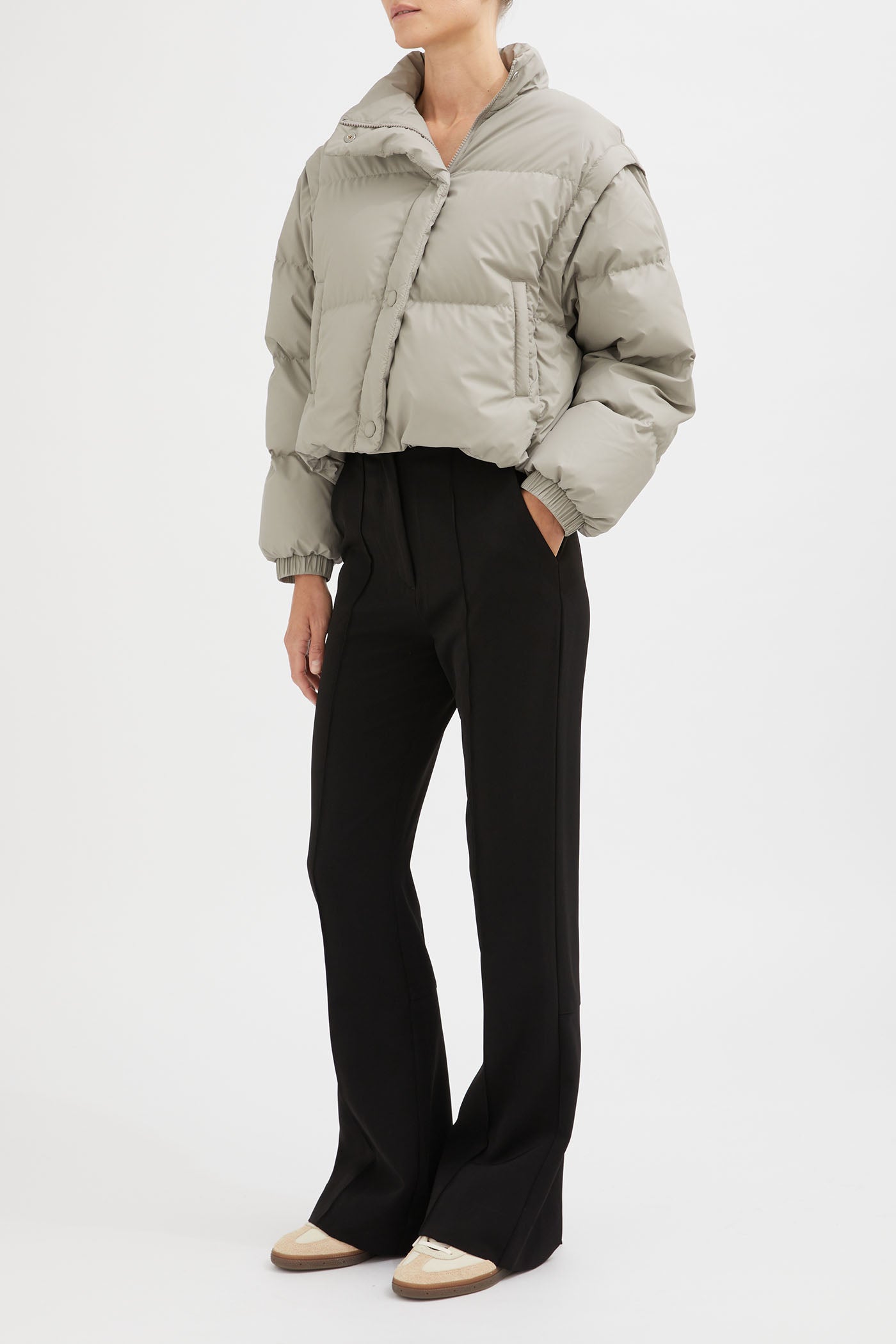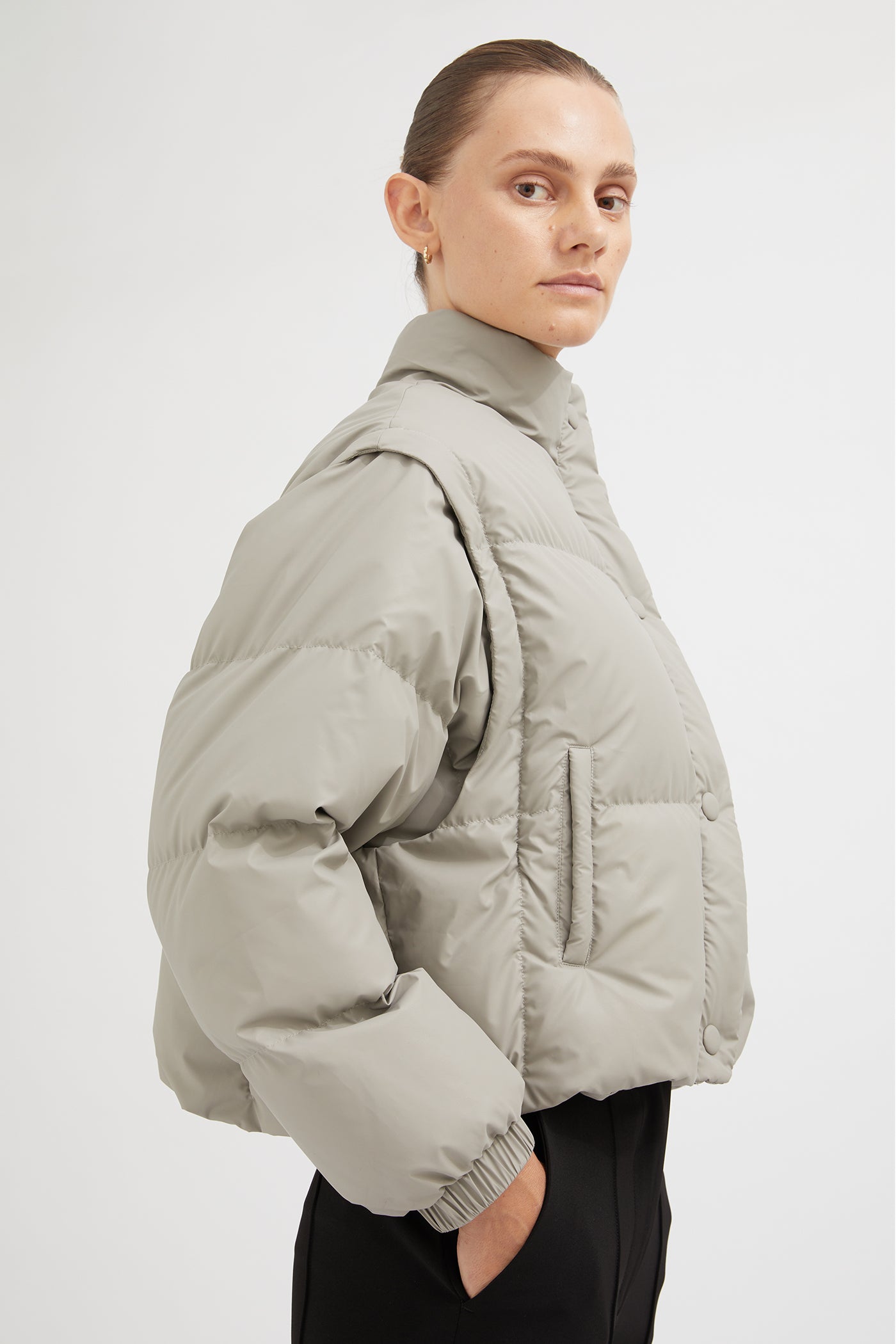 A premium cropped puffer jacket designed with style and function in mind. It is cut from a butter-soft PU-blend fabrication, quilted with insulating duck down. Adjustable drawcords at the hem allow heat to be locked in. Detachable sleeves transform the jacket into a vest, offering enhanced versatility for varying weather.