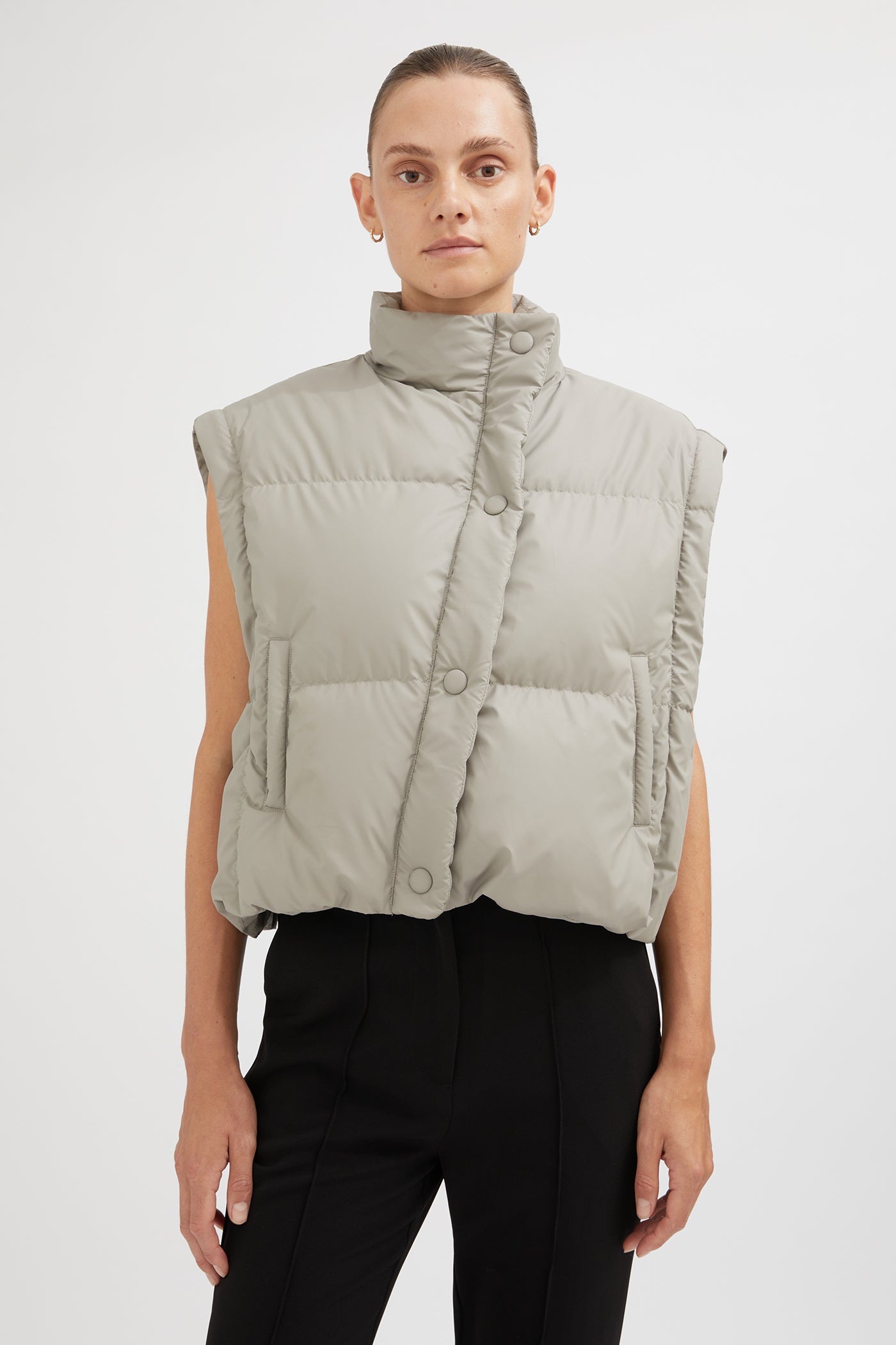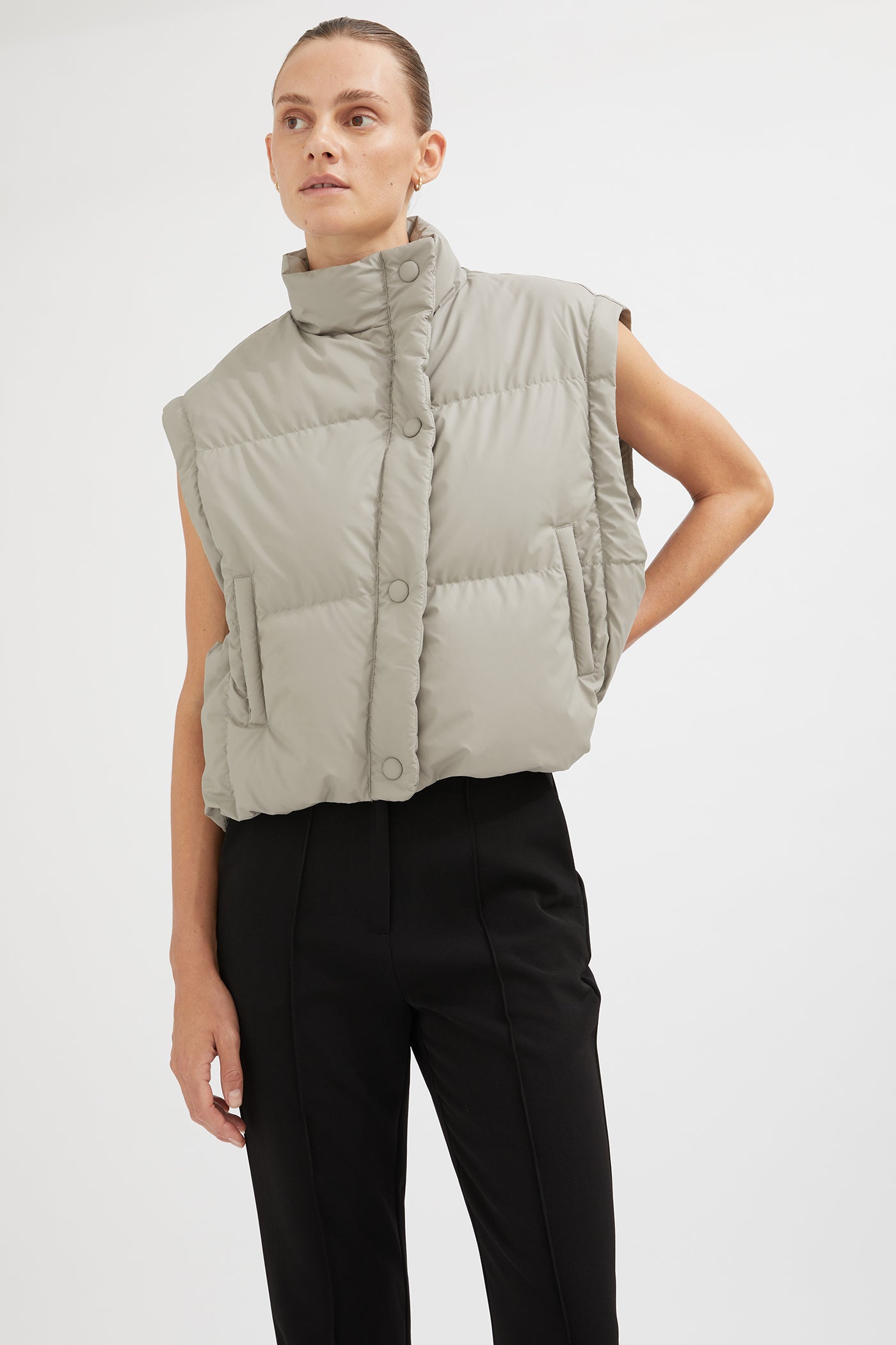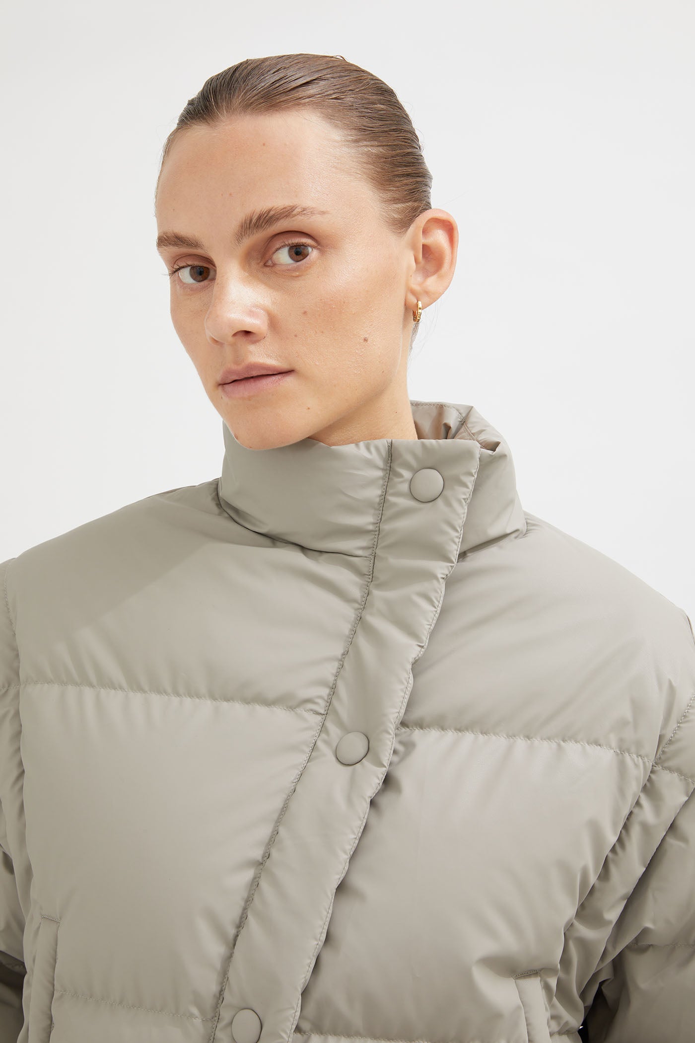 A premium cropped puffer jacket designed with style and function in mind. It is cut from a butter-soft PU-blend fabrication, quilted with insulating duck down. Adjustable drawcords at the hem allow heat to be locked in. Detachable sleeves transform the jacket into a vest, offering enhanced versatility for varying weather.