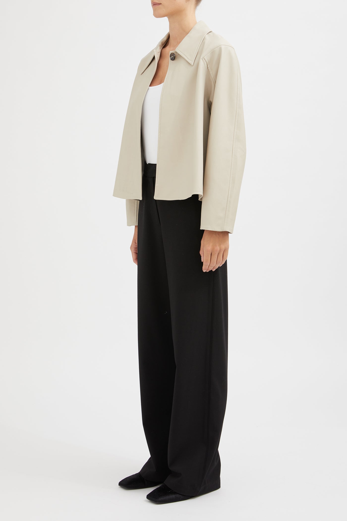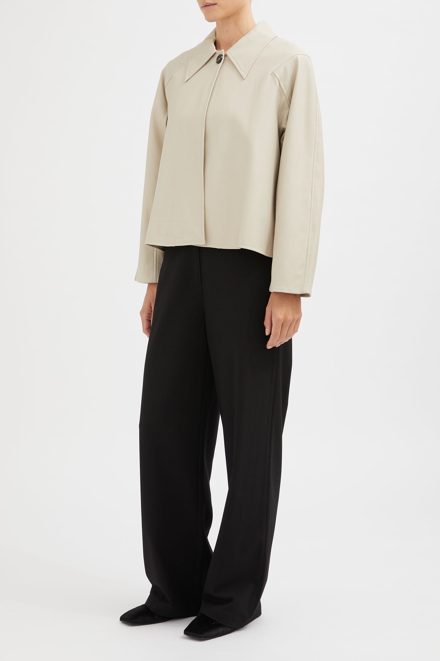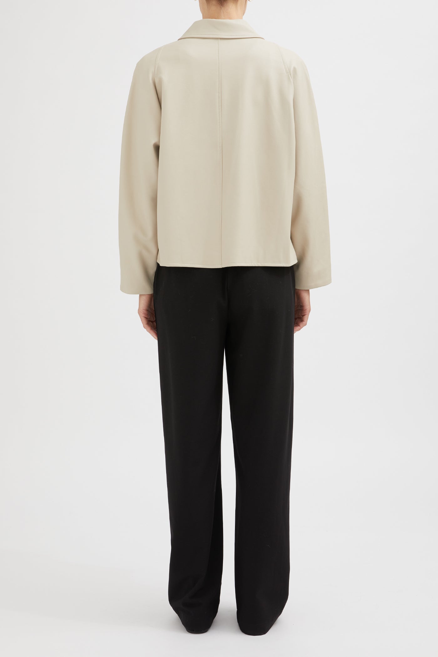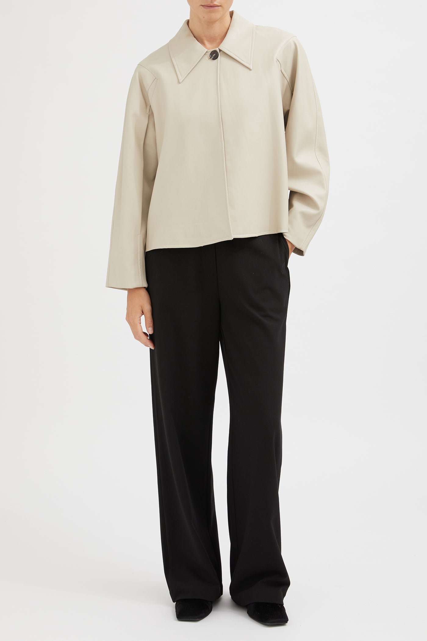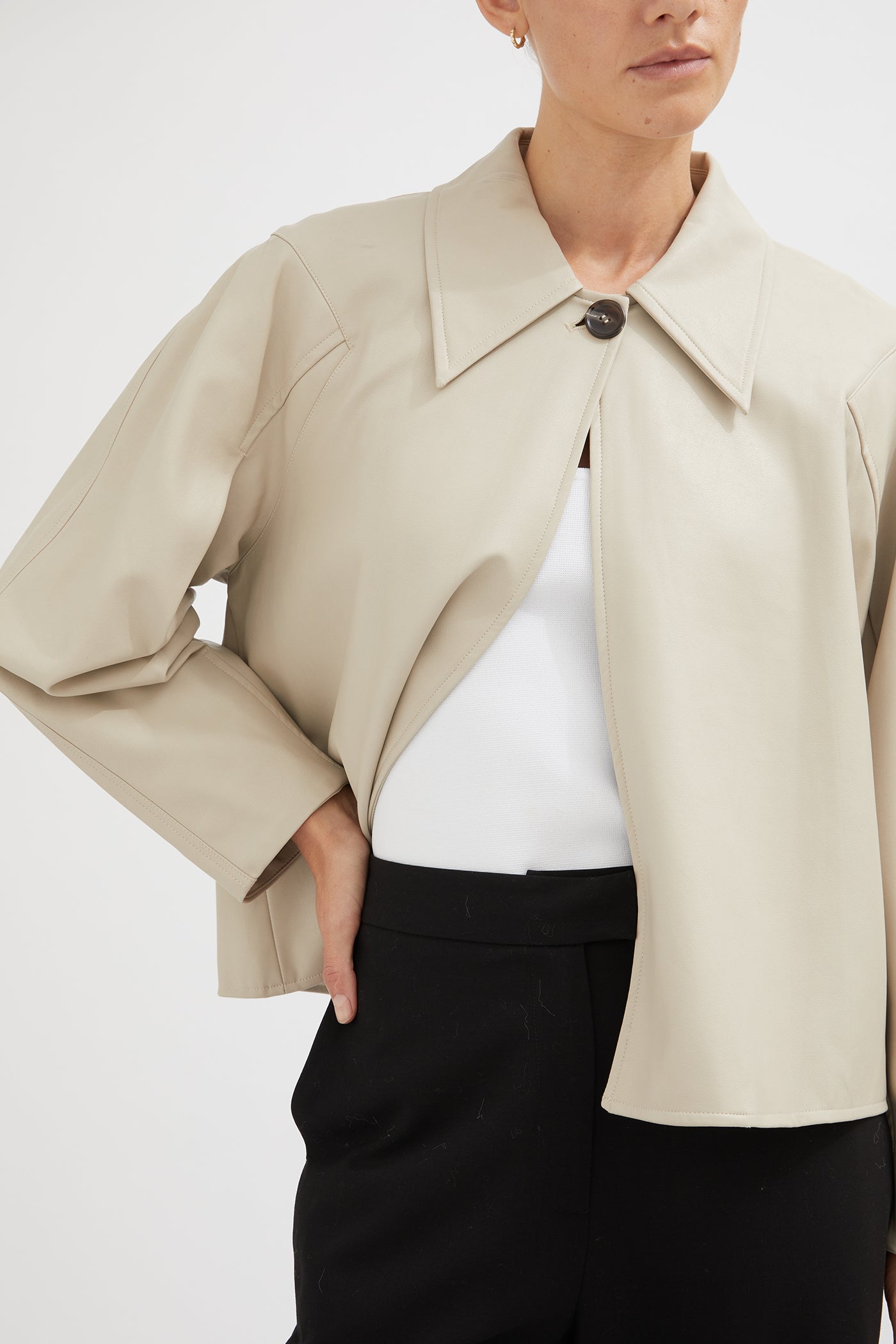 A minimally detailed vegan leather jacket. Finished with a relaxed fit, a single button closure allures to a timeless consideration. Pleats in the sleeve give optimal comfortability and room to wear as a layering piece.