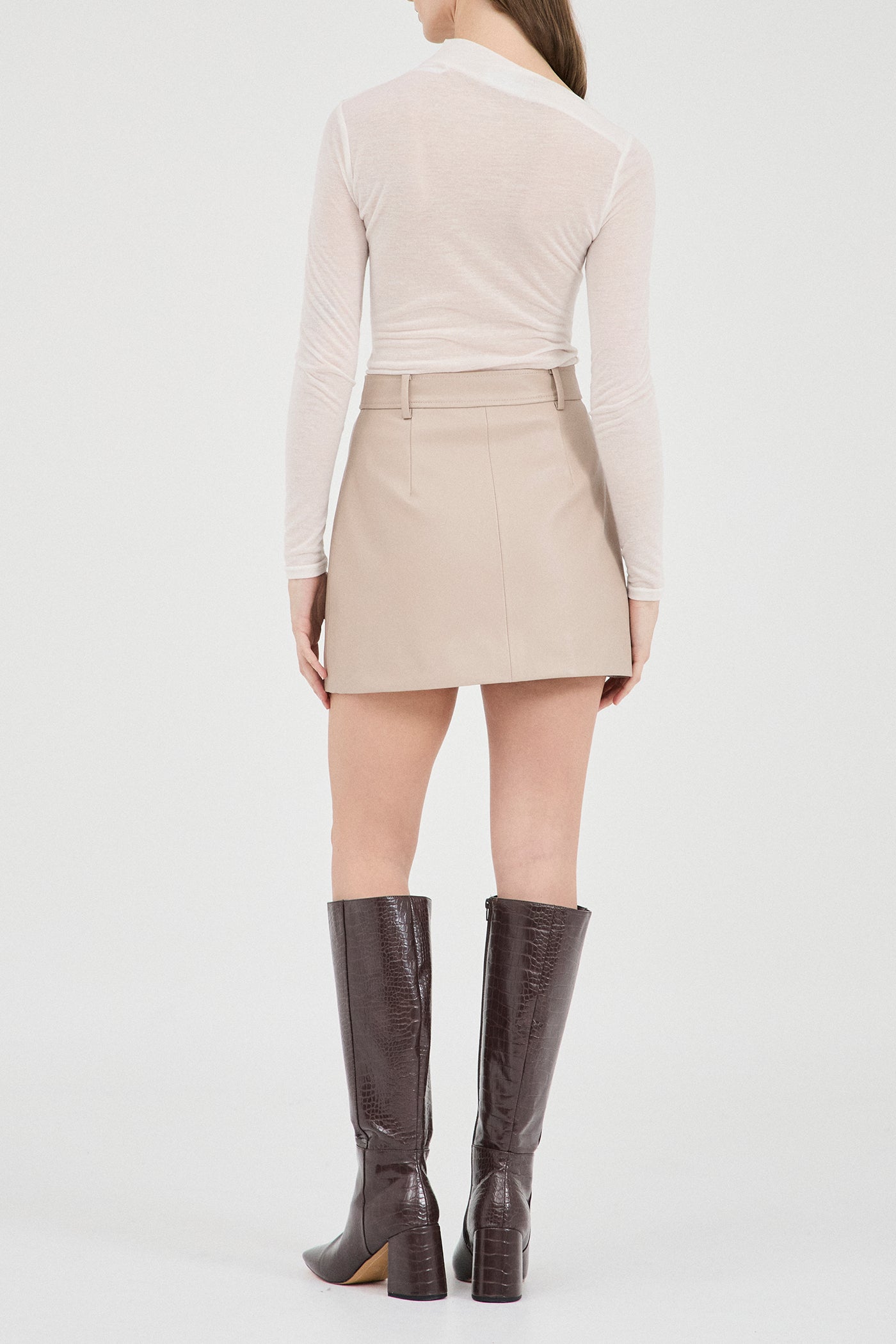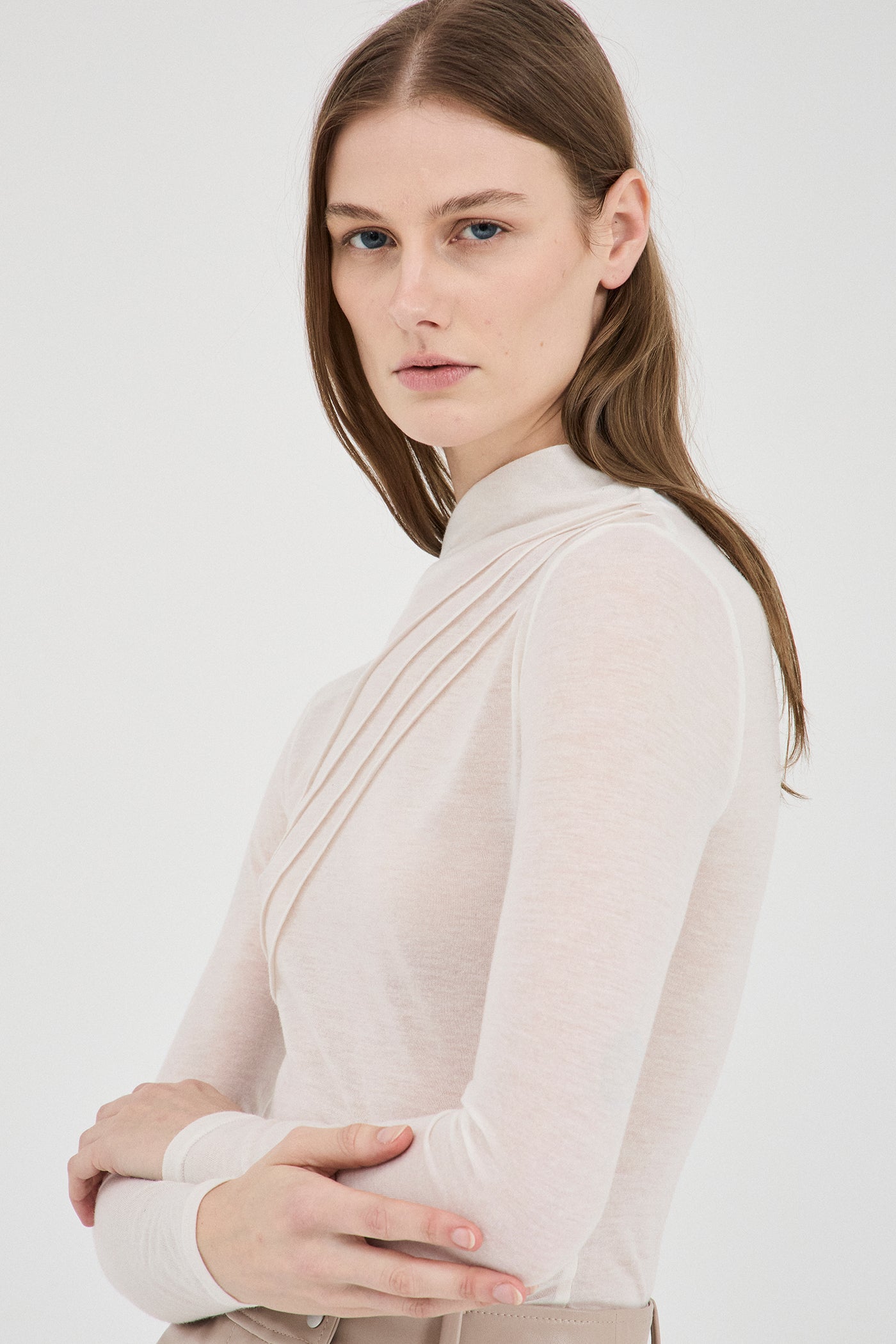 A sleek long-sleeve top crafted from light, slightly sheer cotton-blend fabrication for a delicate effect. Elevated through detail, featuring an asymmetric mock neck and pin-tuck stitched design throughout.